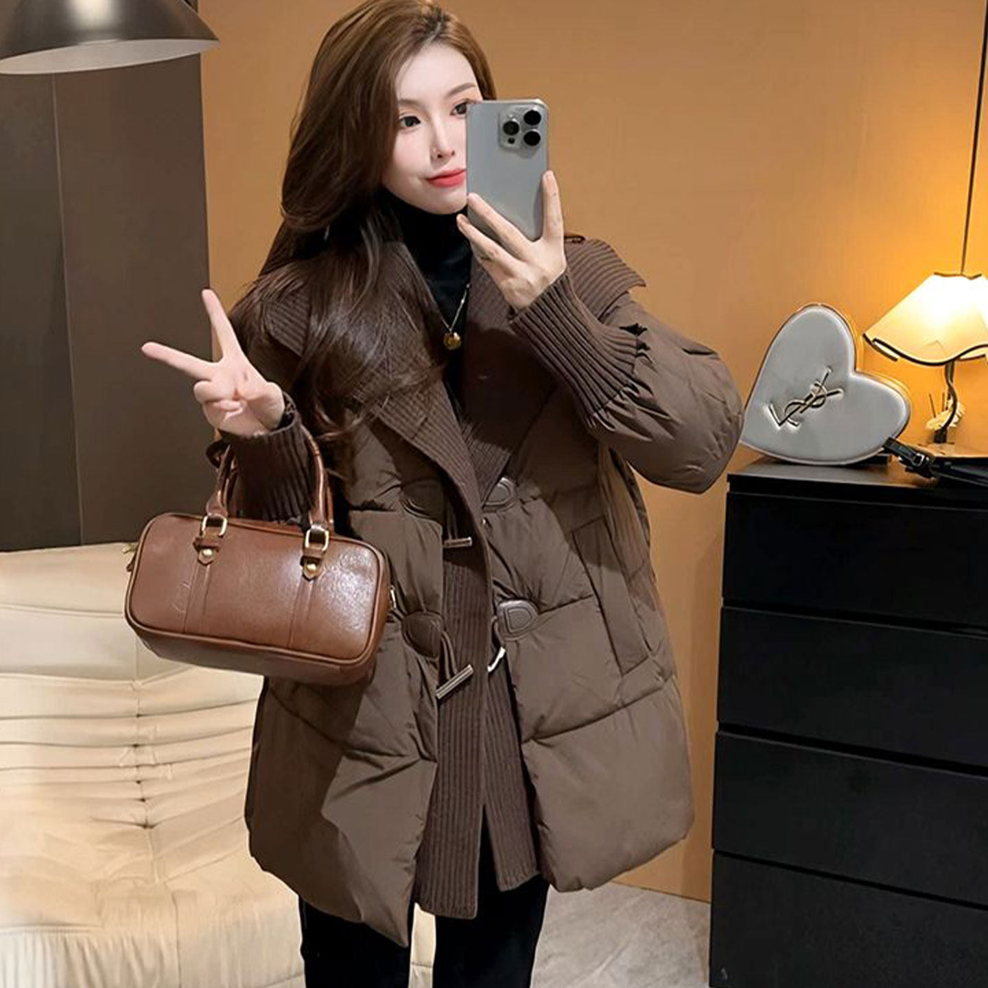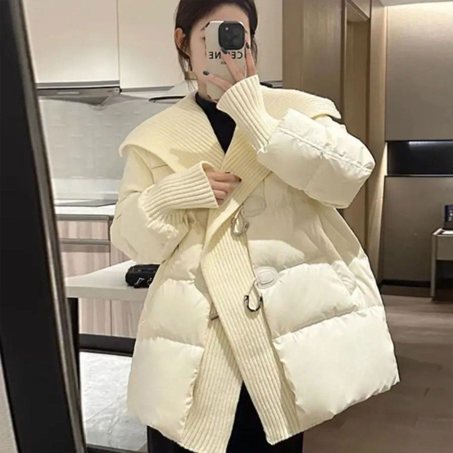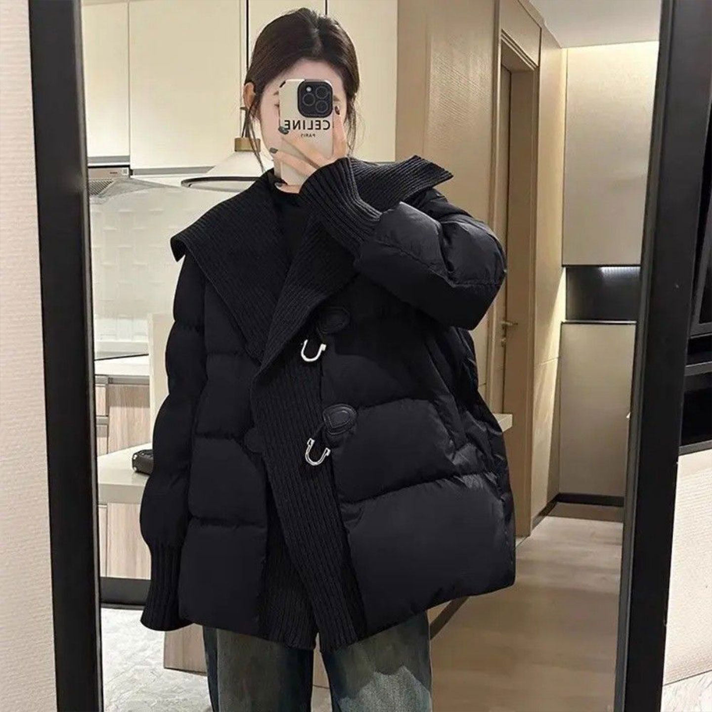 韩版百搭加厚保暖棉服外套女冬季新款宽松洋气拼接针织棉衣妈妈装
