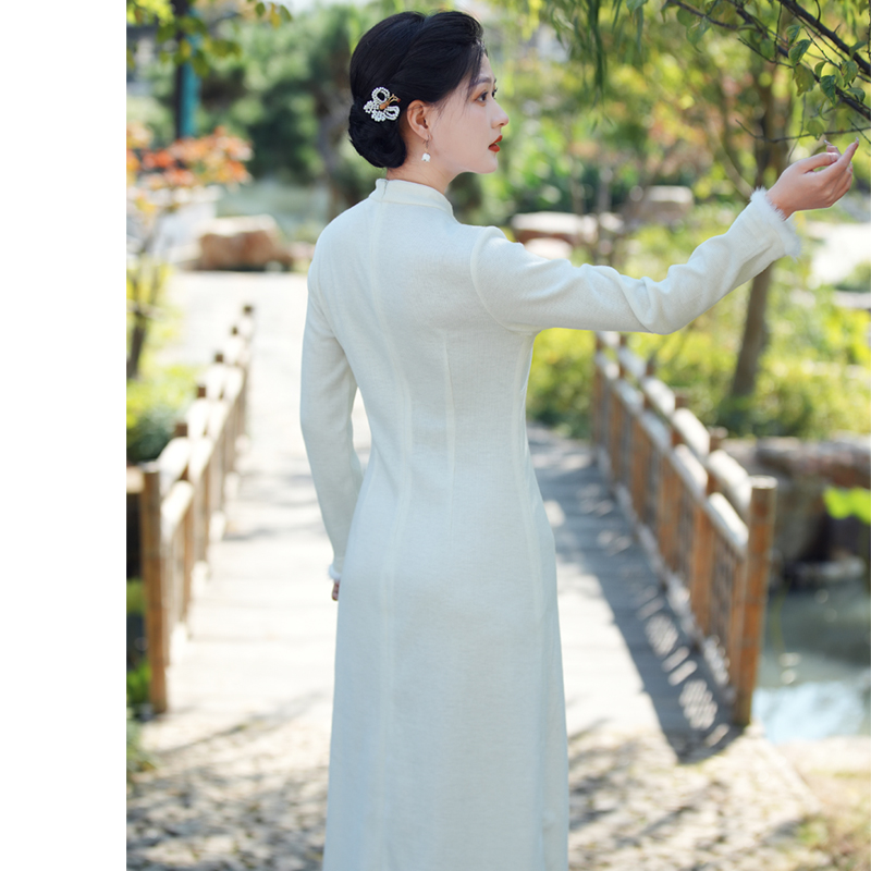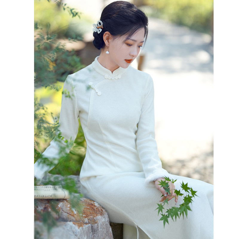 怜雪 秋冬新中式民国风白色连衣裙修身内搭打底针织改良旗袍长裙
