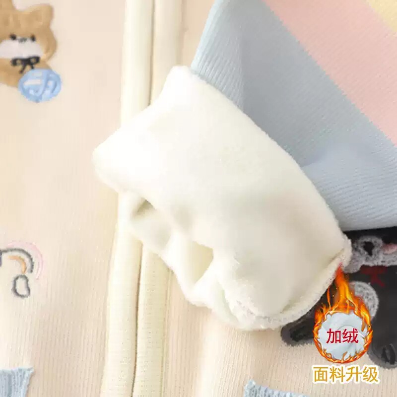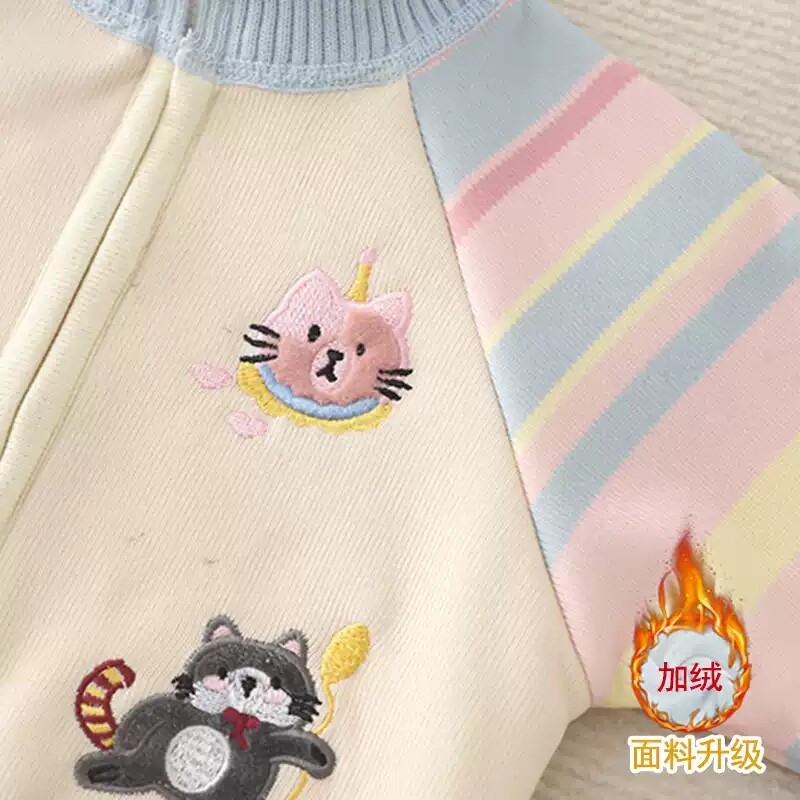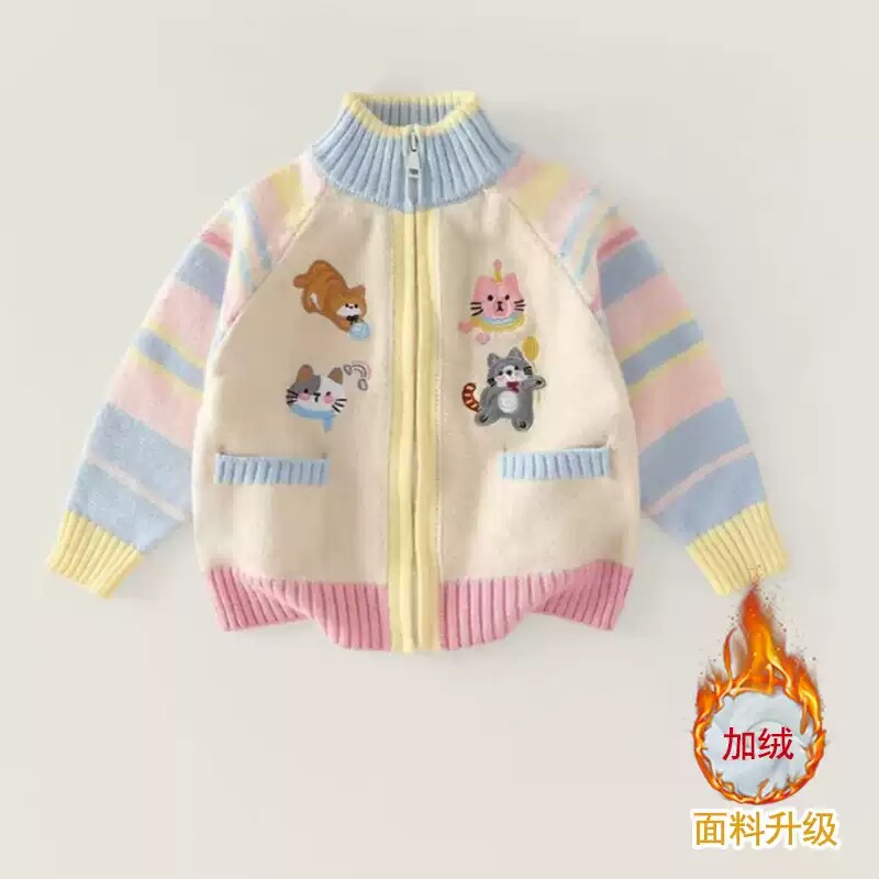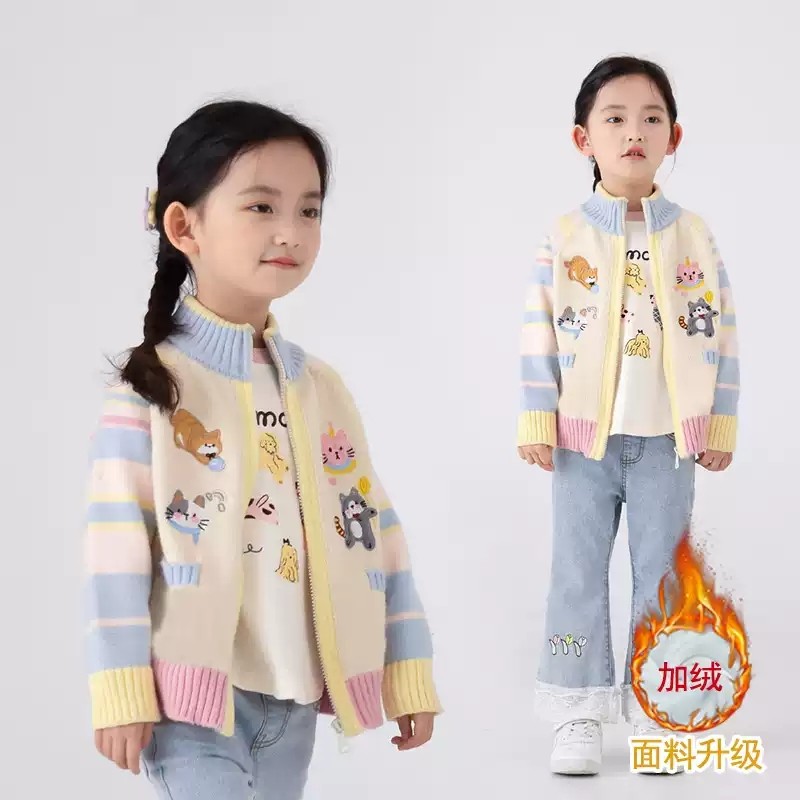 女童毛衣秋冬新款中大童针织拉链开衫加绒刺绣卡通一体绒保暖外套