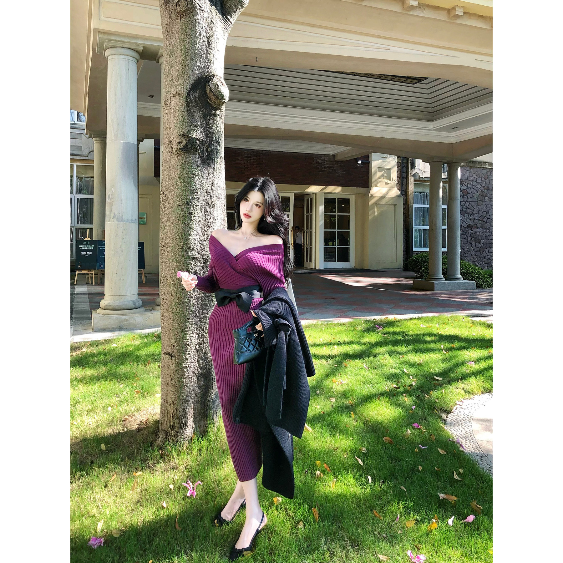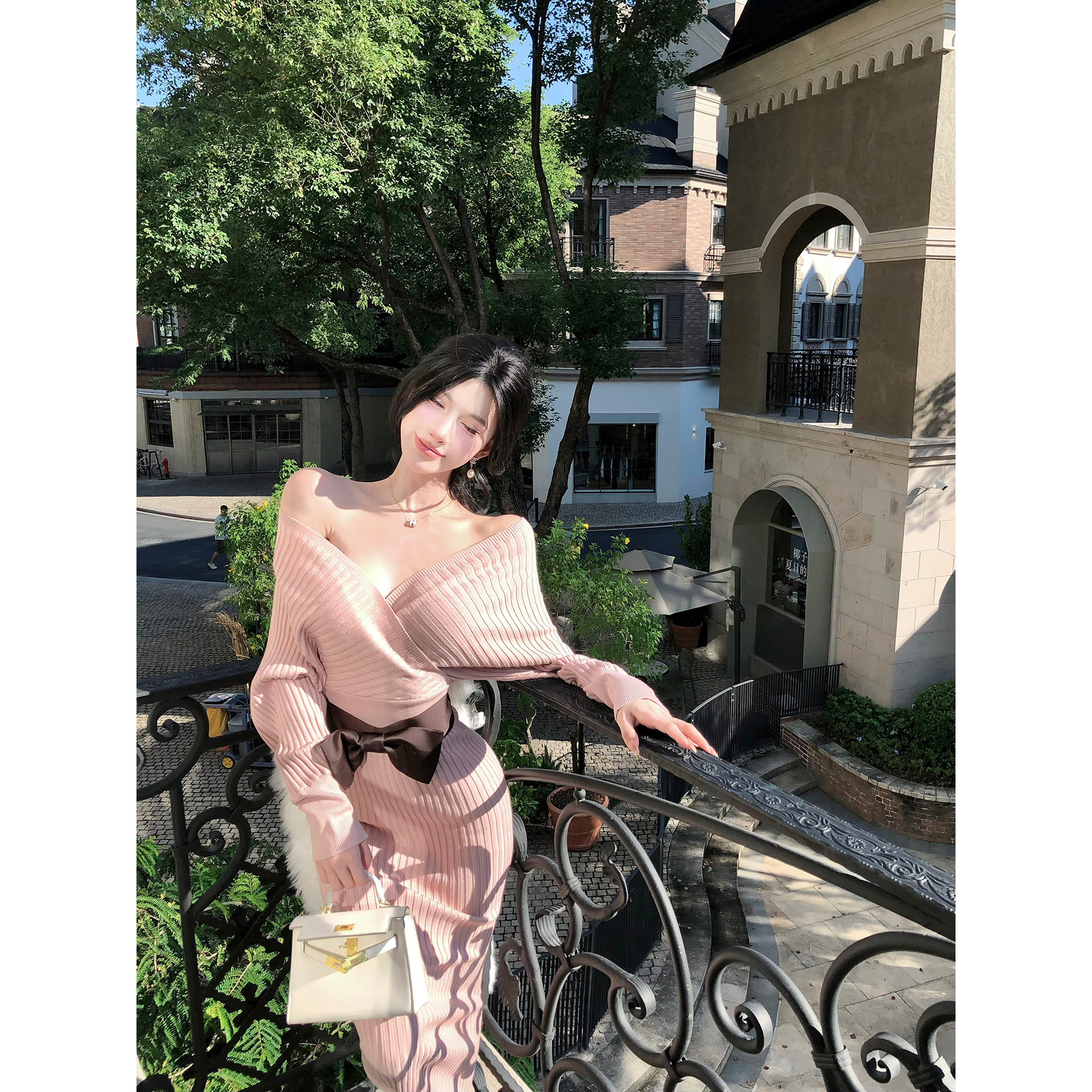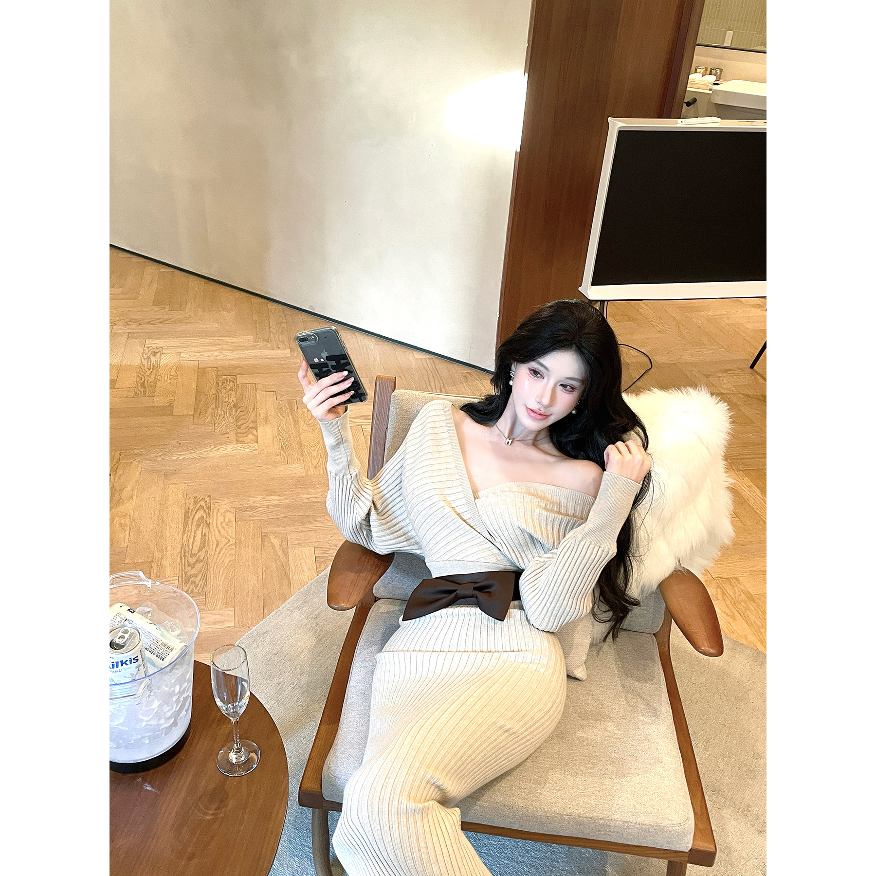 灰尘邓邓 V领针织连衣裙女2025冬季法式收腰长裙包臀裙长袖裙子
