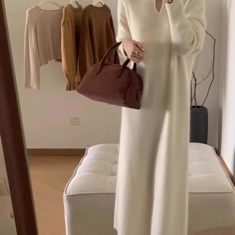 秋冬新中式立领白色m毛衣裙连衣裙女赫本风超好看内搭针织打底长
