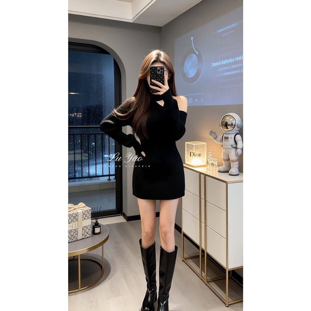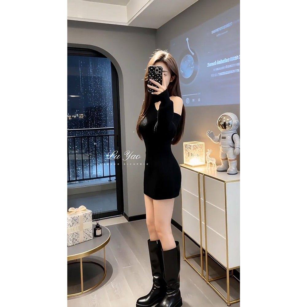 实价有货性感露肩黑色长袖针织连衣裙女2025秋冬新款显瘦包臀裙