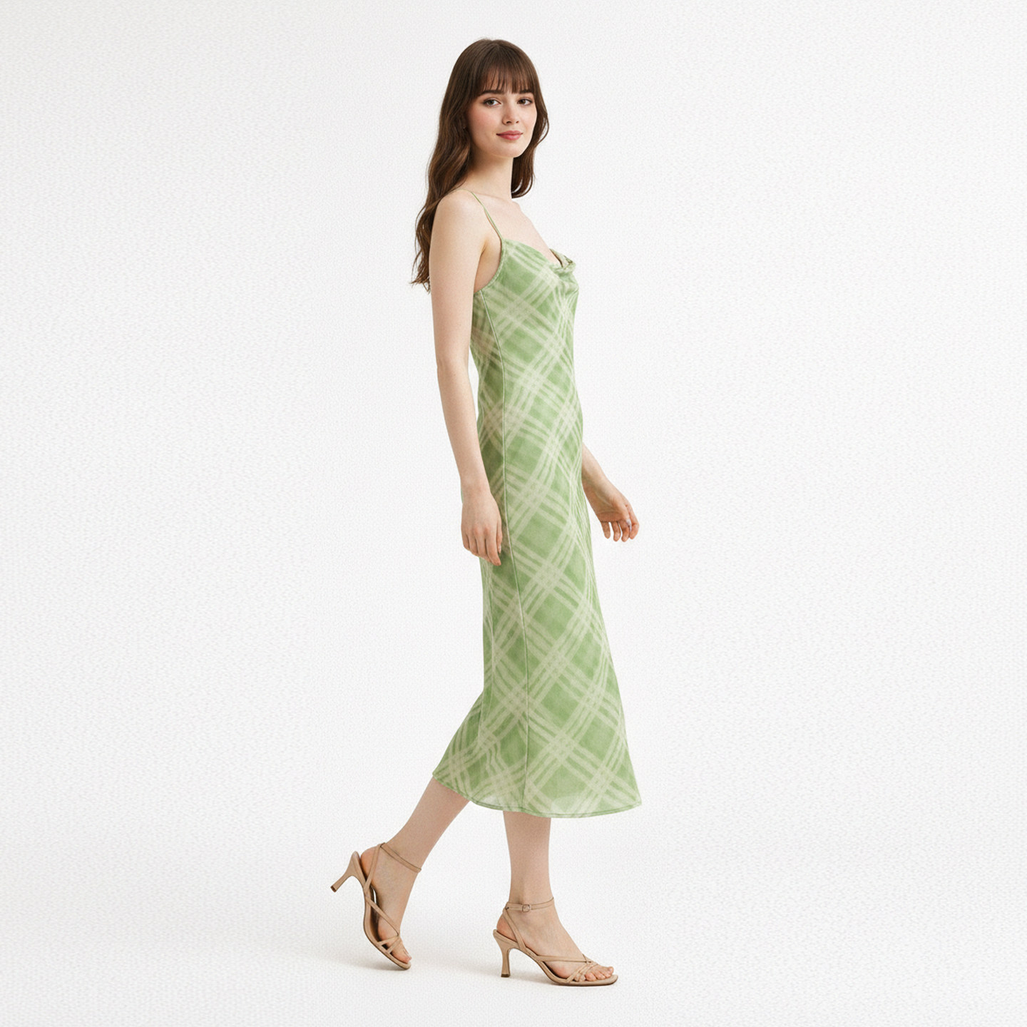 2026夏季新款休闲度假优雅气质复古绿色格子中长款修身吊带连衣裙
