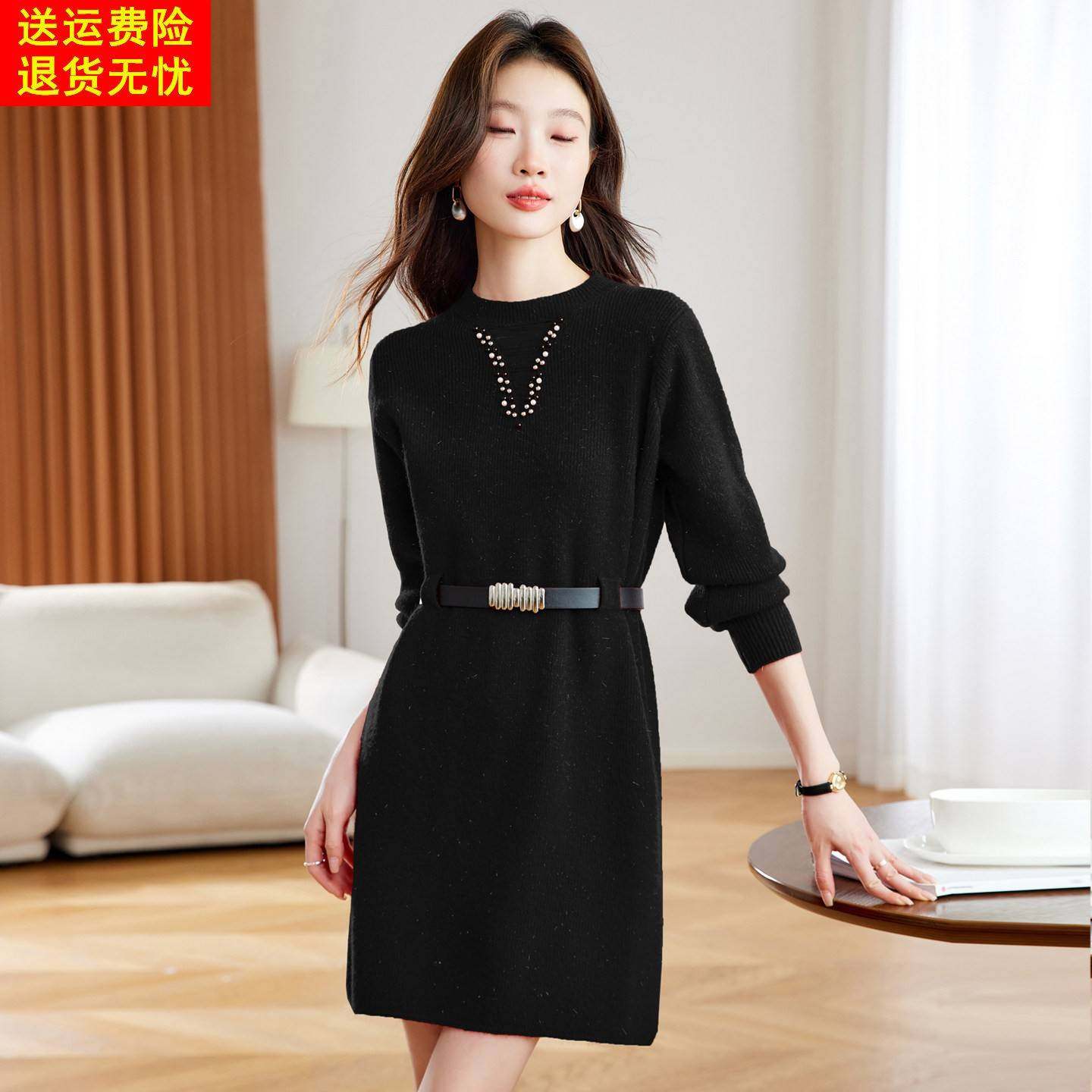 红色针织连衣裙女2025秋冬时尚洋气圆领收腰显瘦中长款圣诞毛衣裙