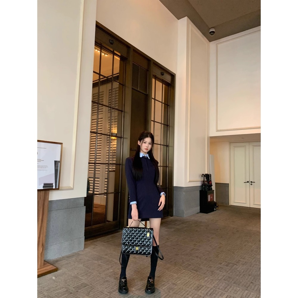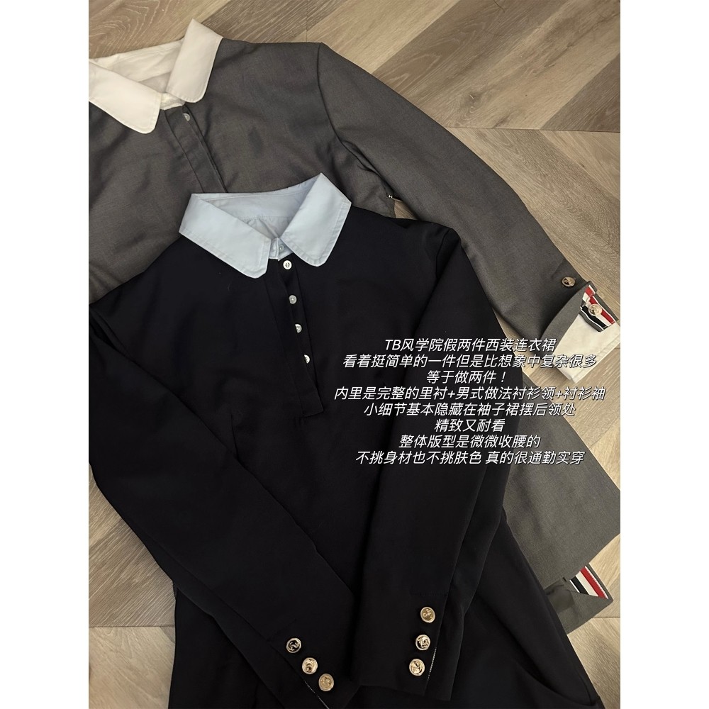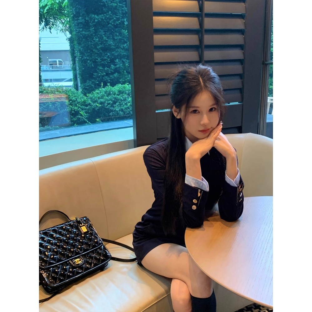 早秋长袖西装连衣裙女设计感小众收腰假两件高级感黑色裙子春秋季