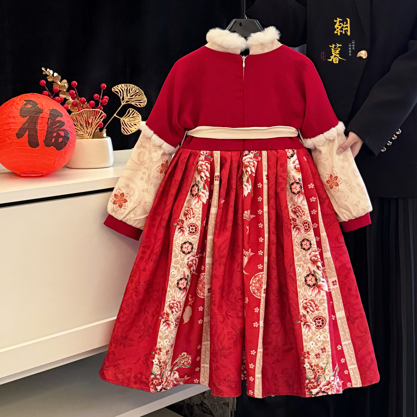 汉服女童连衣裙冬装2026新款新年装古风襦裙儿童红色拜年服公主裙