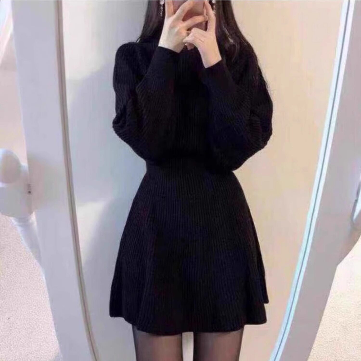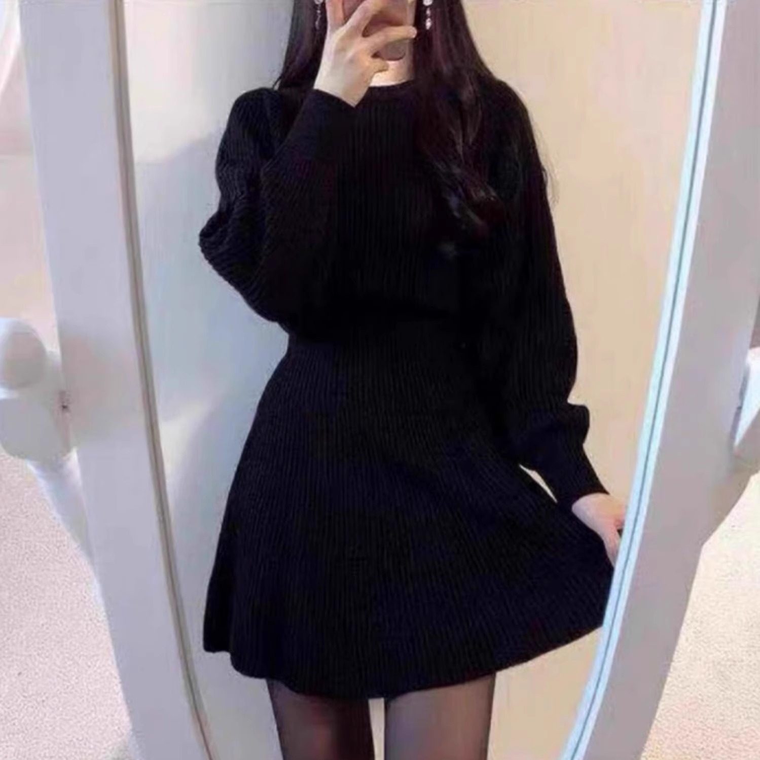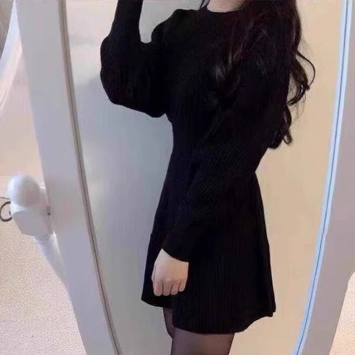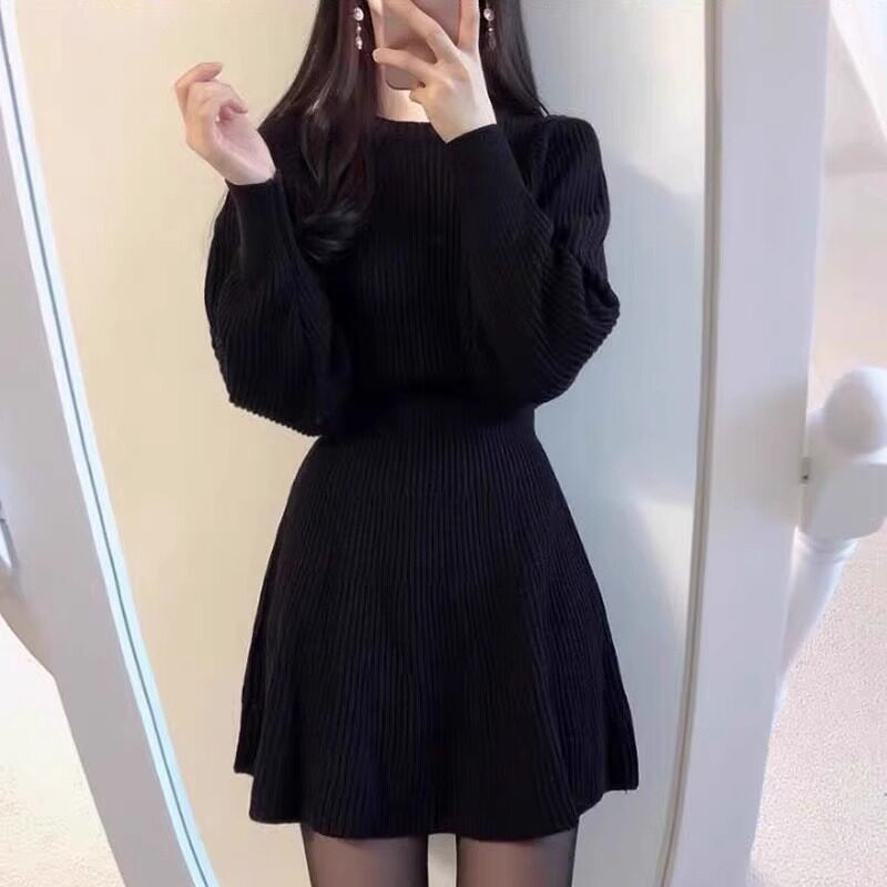 秋冬季新款加厚毛衣裙子赫本风内搭配大衣圆领针织连衣裙收腰修身