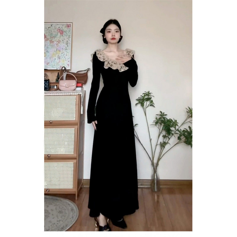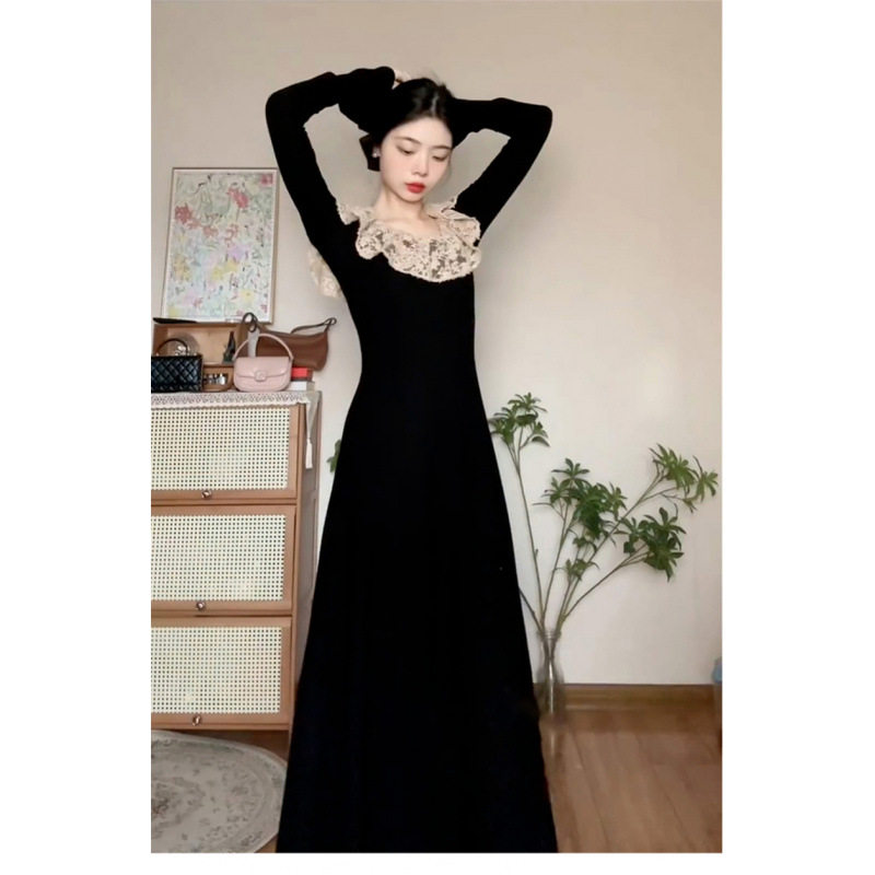 法式赫本风巨好看黑色长袖连衣裙女秋冬季配大衣内搭打底修身长裙