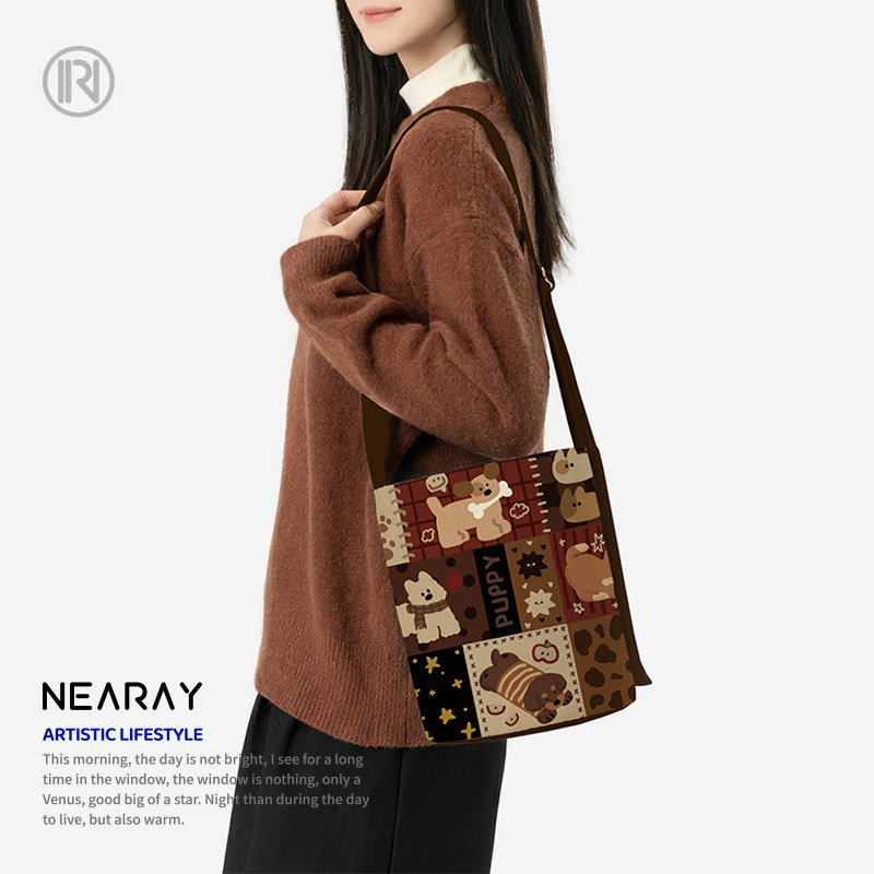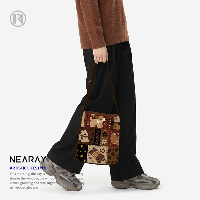 可爱小狗拼贴斜挎包大容量帆布包学生上课百搭单肩包带拉链Q358