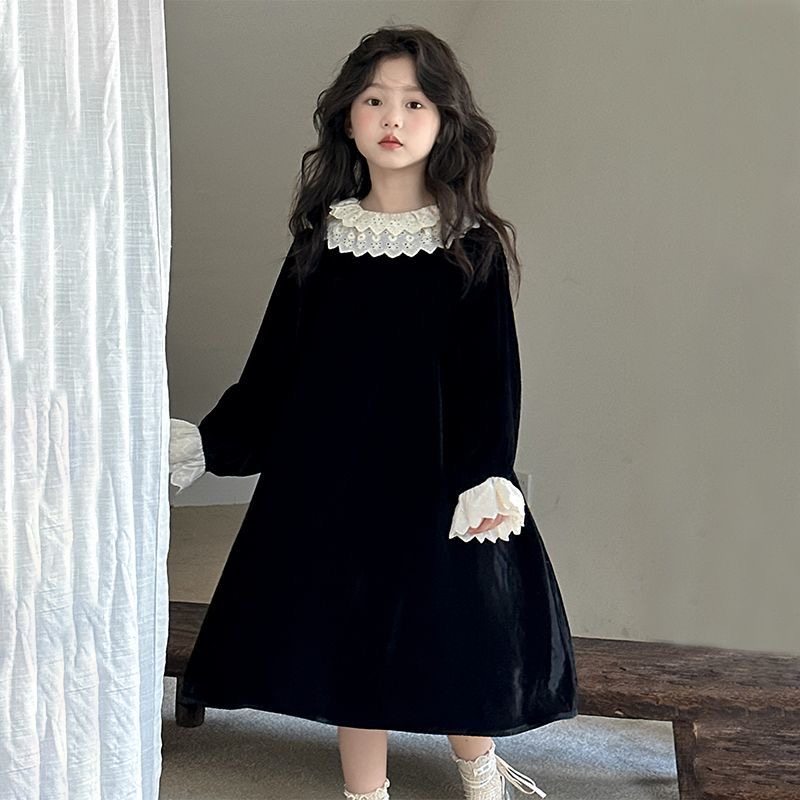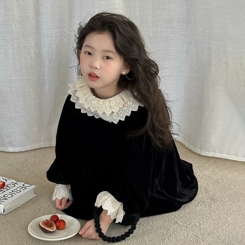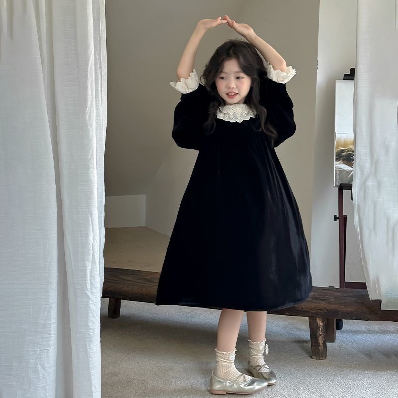 女童连衣裙春秋2026新款儿童高级感丝绒礼服裙女孩蕾丝公主裙洋气