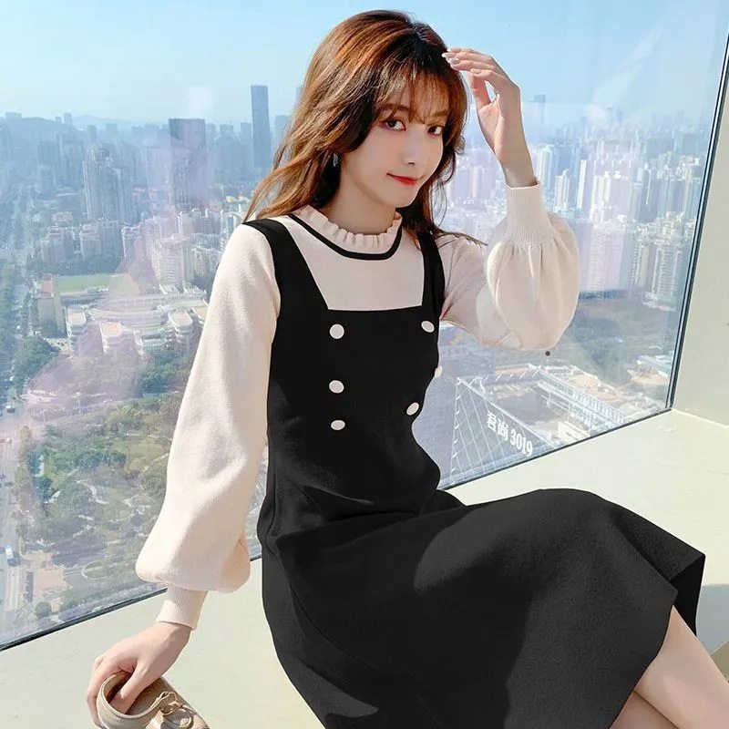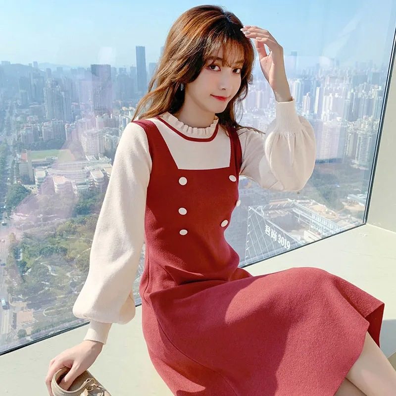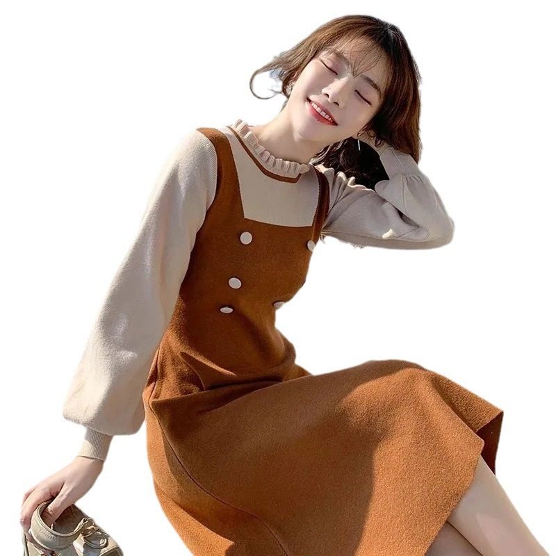 假两件针织连衣裙女秋冬小个子甜美减龄收腰显瘦中长款内搭毛衣裙