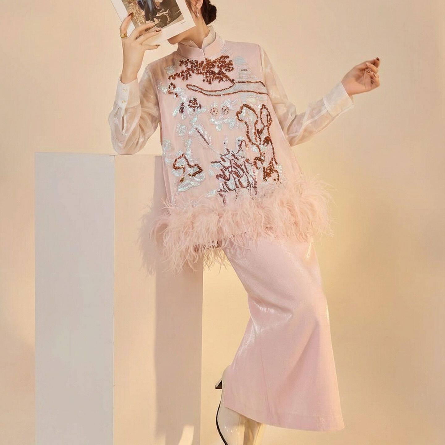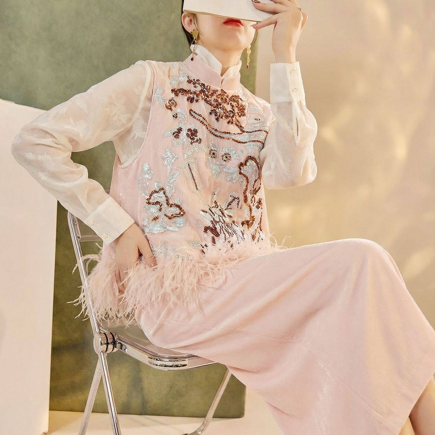 2026春装新款轻奢新中式珠绣拼接鸵鸟毛马甲外套蕾丝衬衫半裙套装