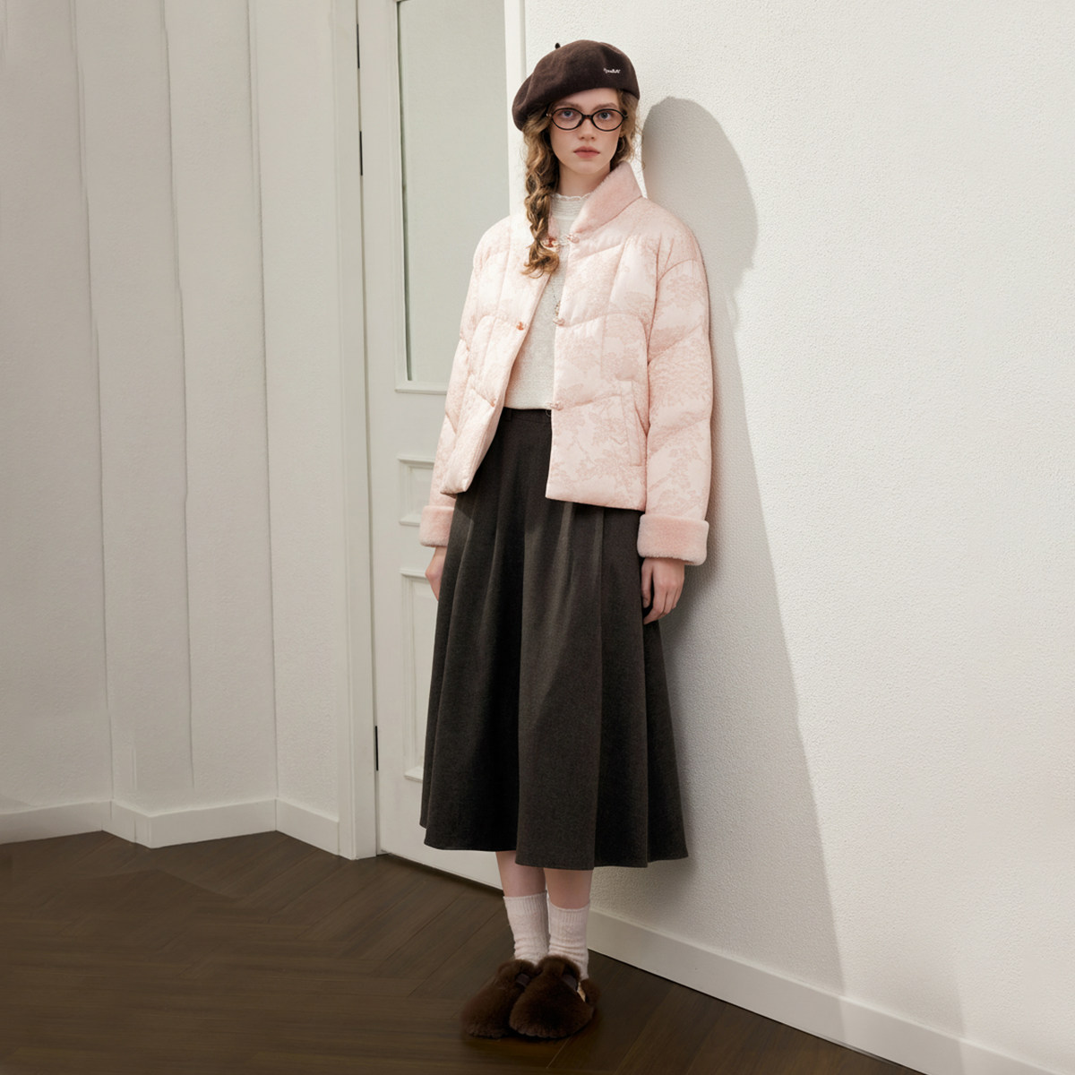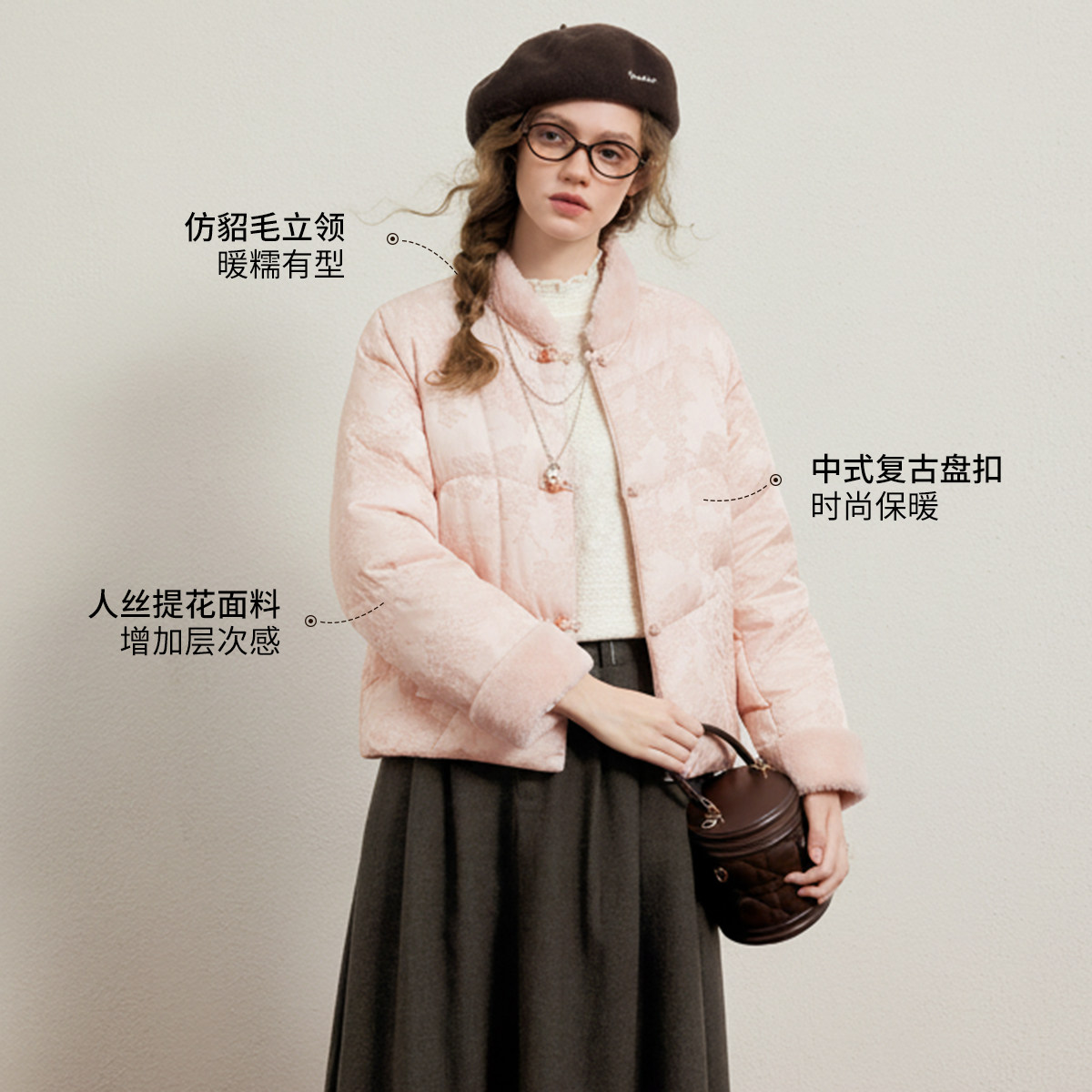 KBNE粉色提花短款国风白鸭绒羽绒服女装2026春装新款中式羽绒外套