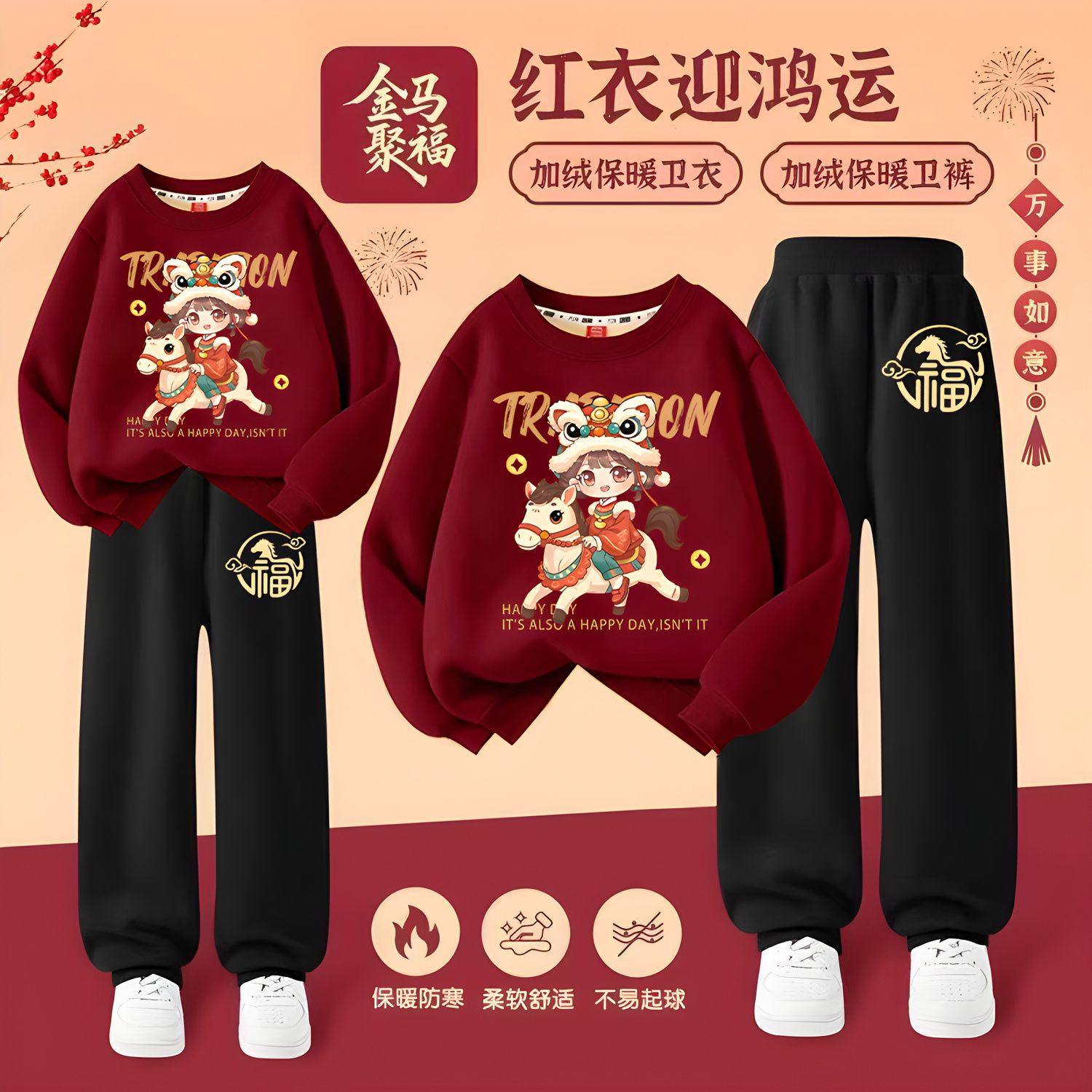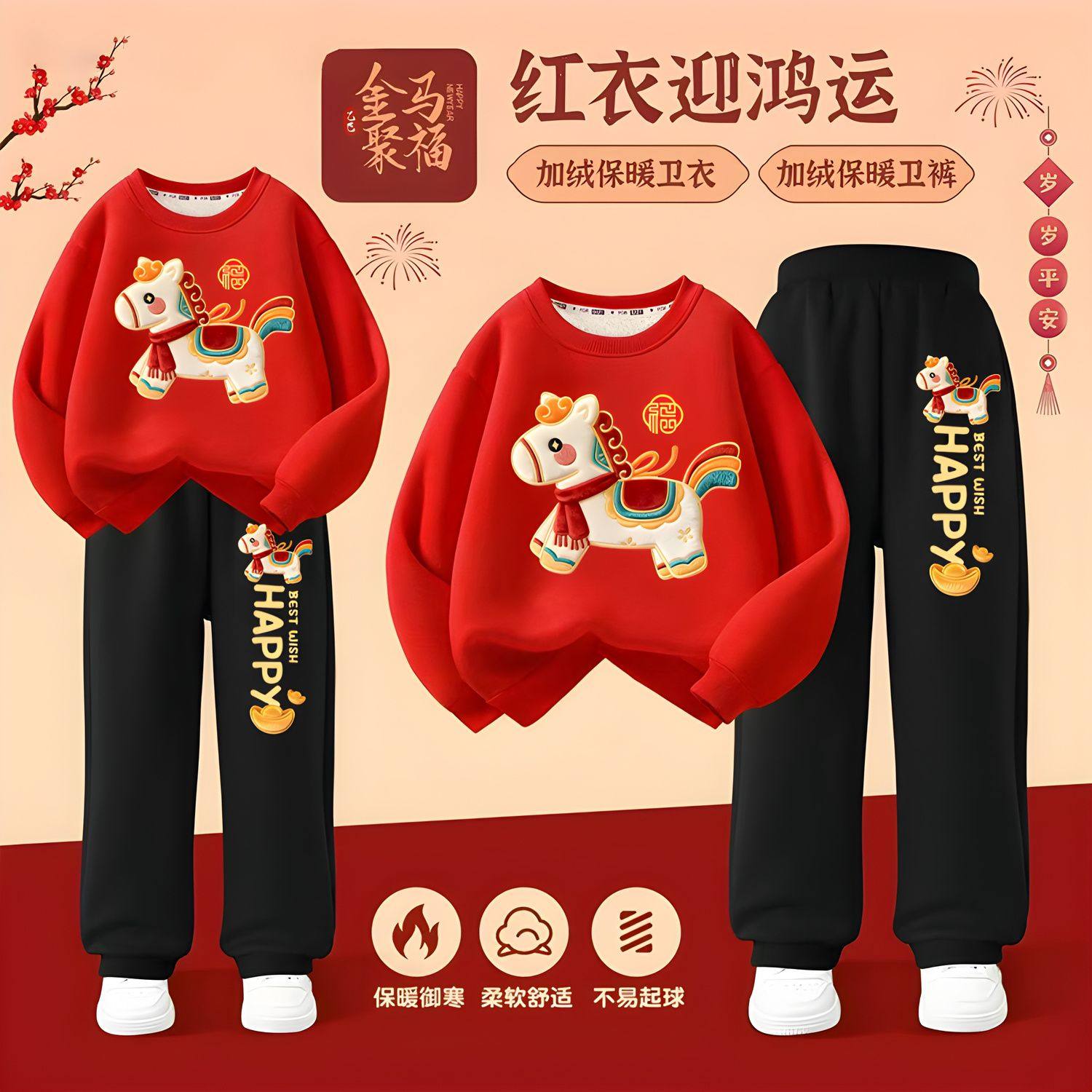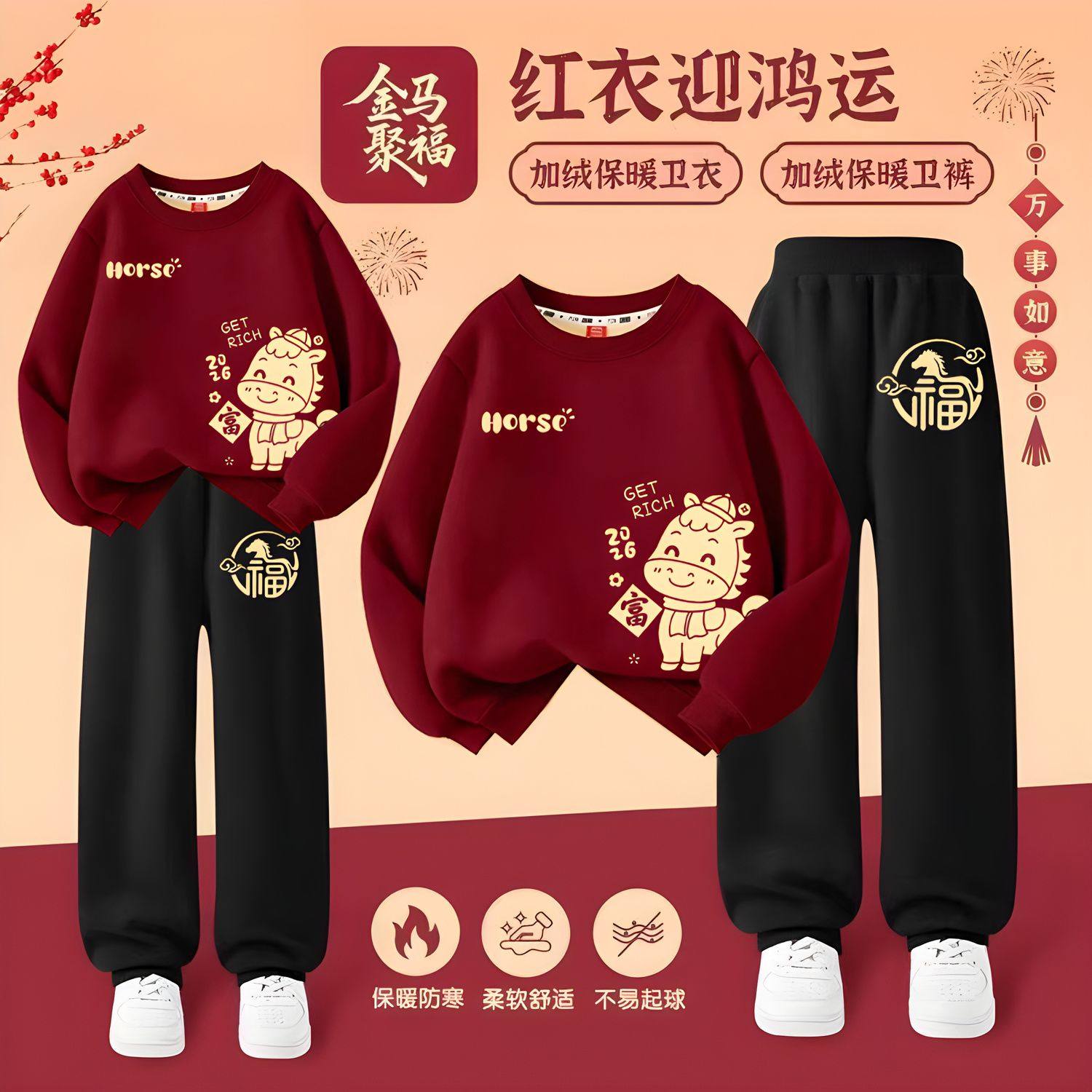 男童加绒红色卫衣套装2026女童马年本命年衣服儿童宝宝新年拜年服