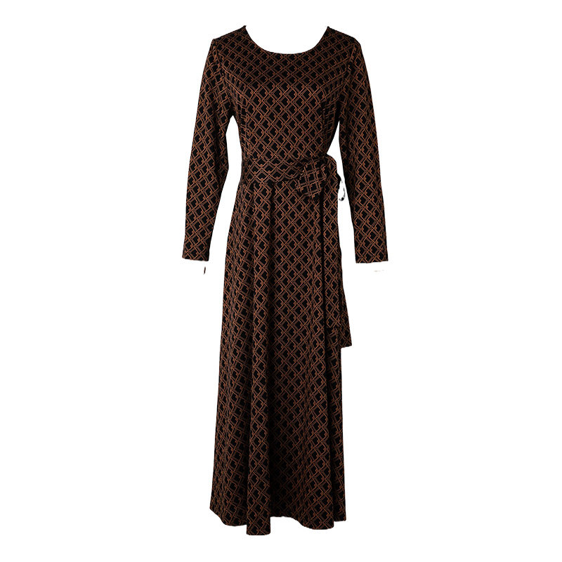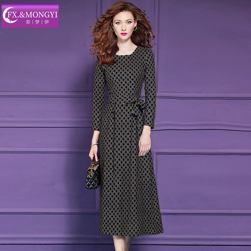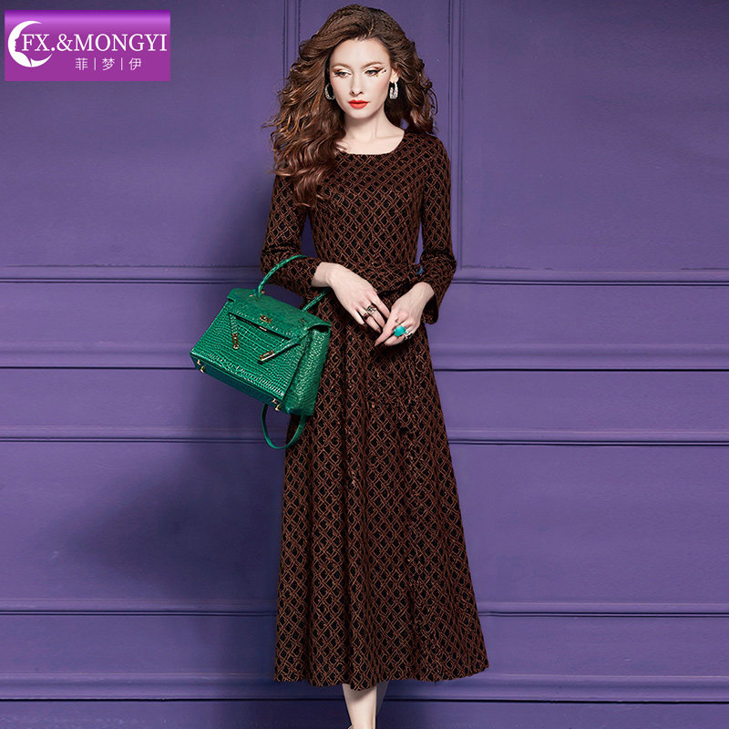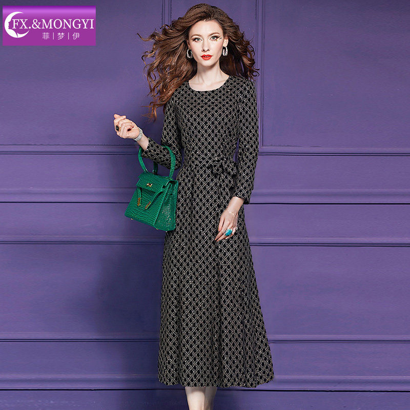 菲梦伊印花连衣裙女冬季法式复古轻熟系带收腰圆领中长款打底长裙