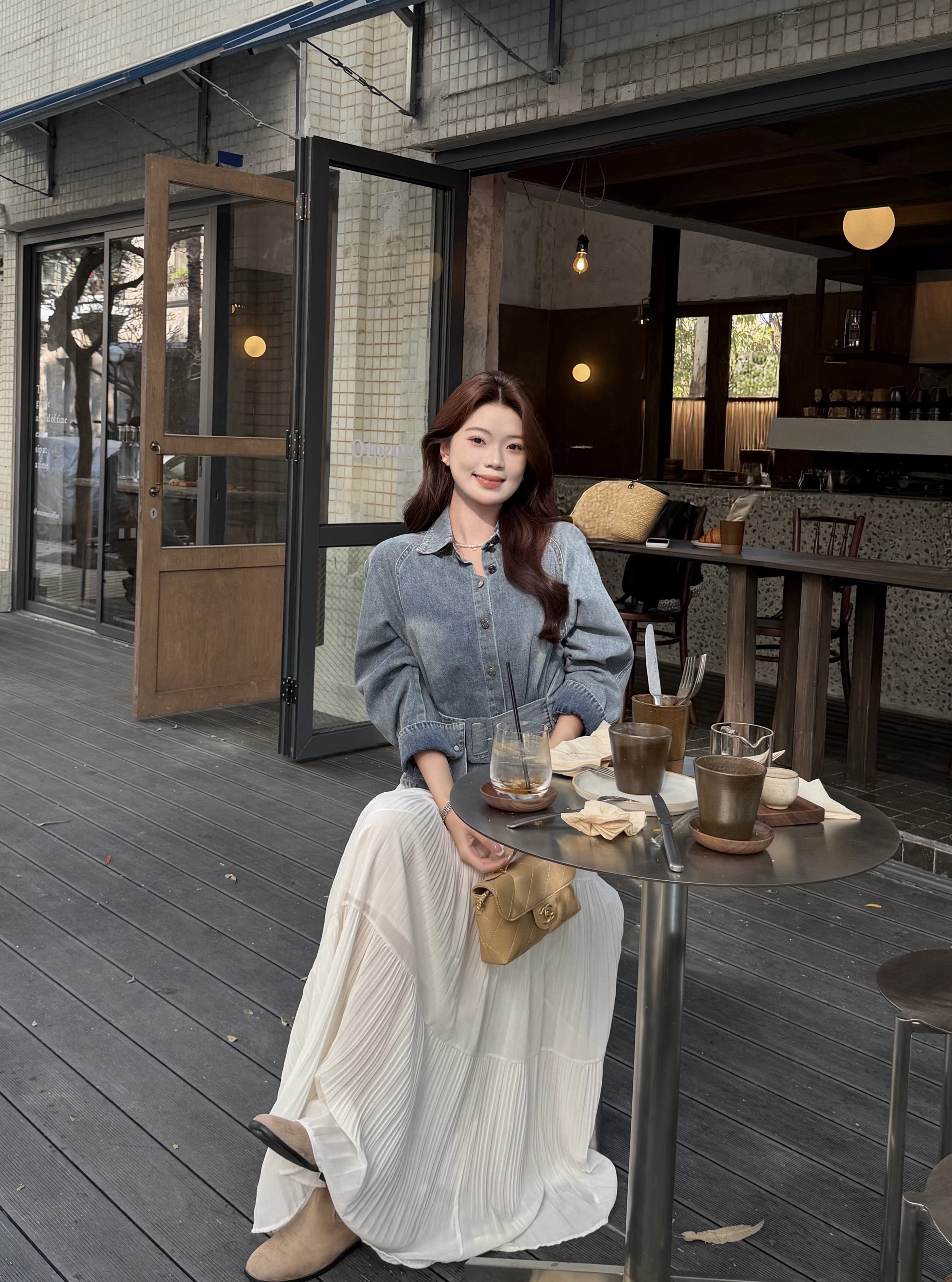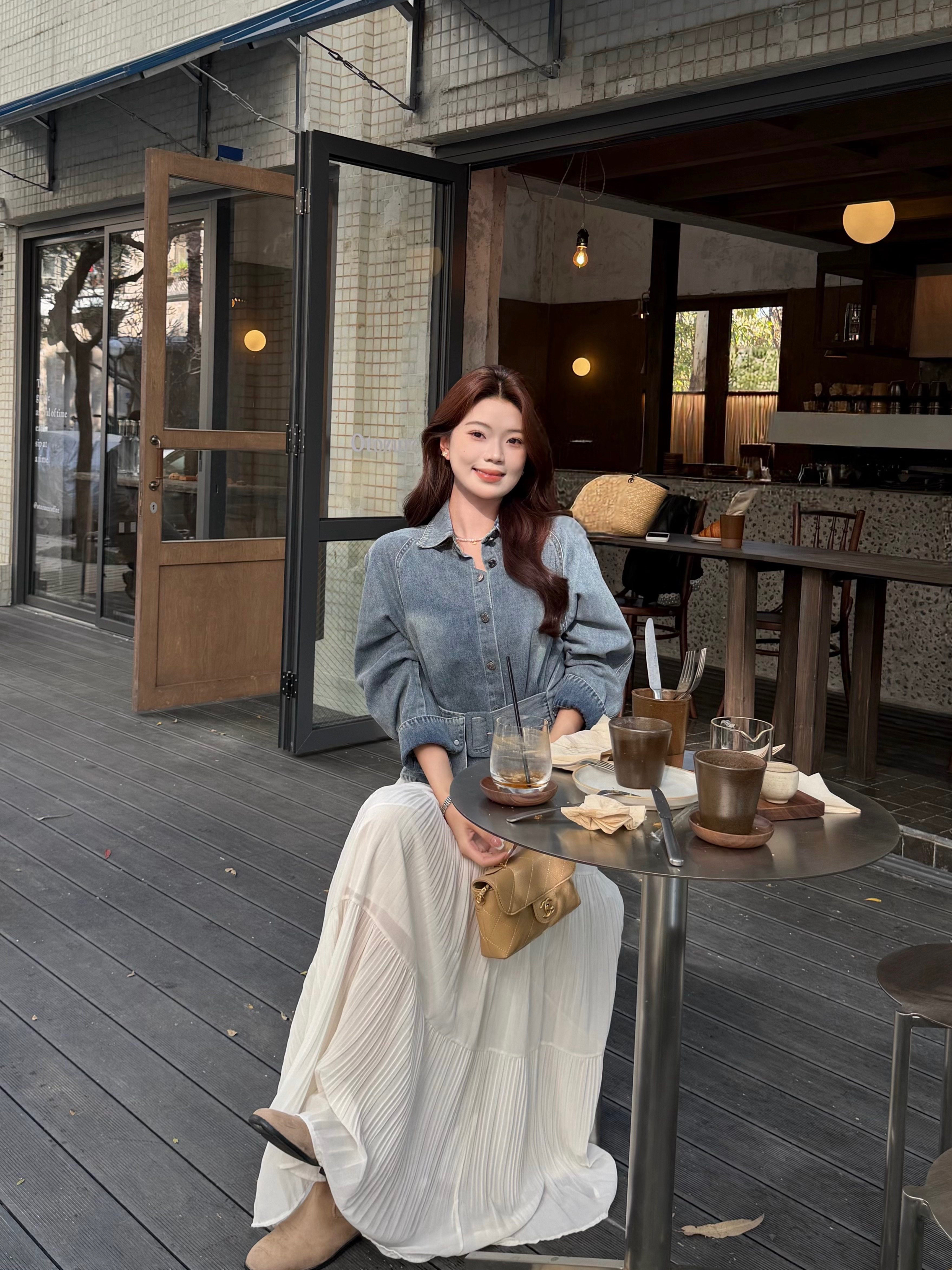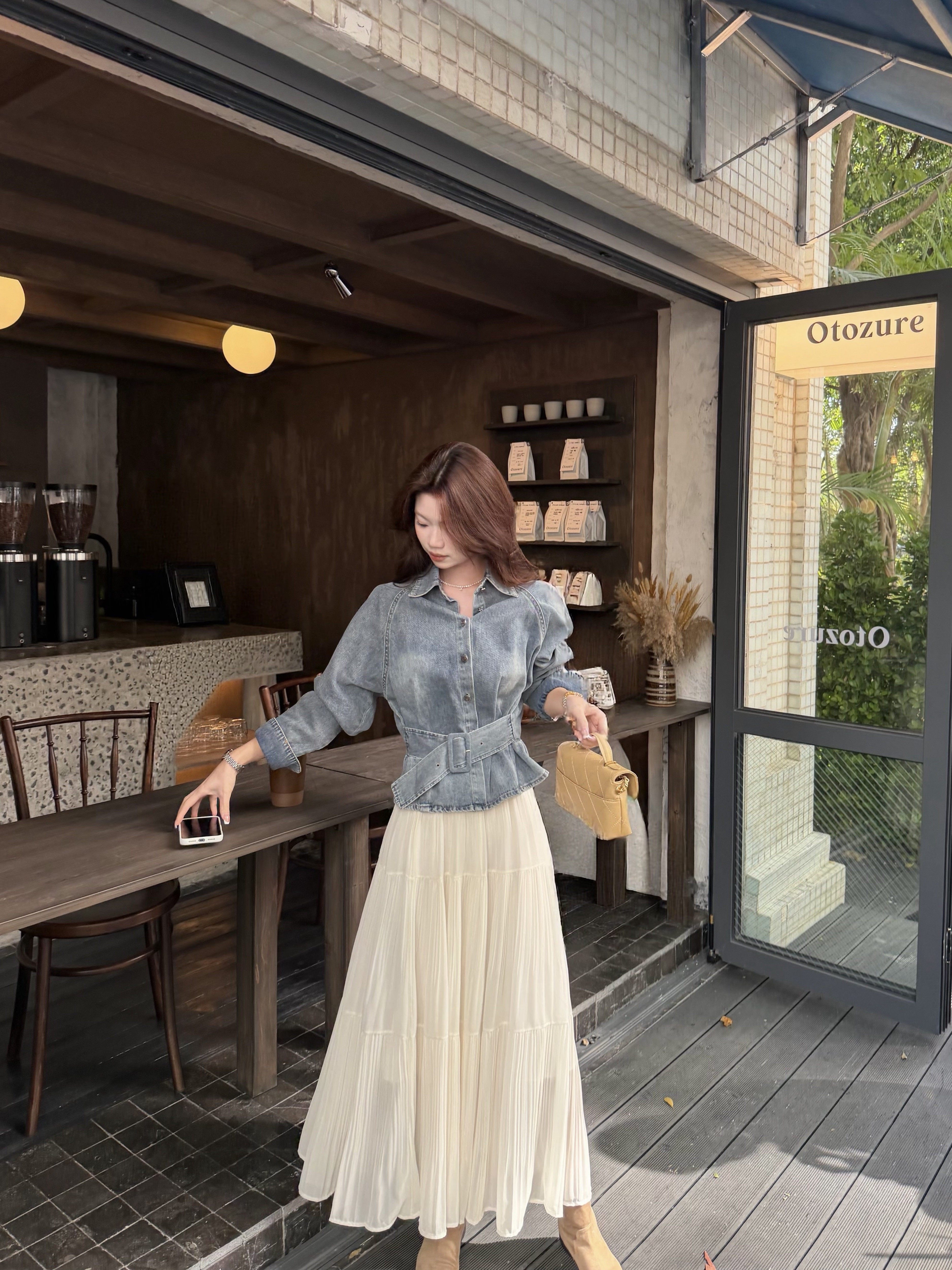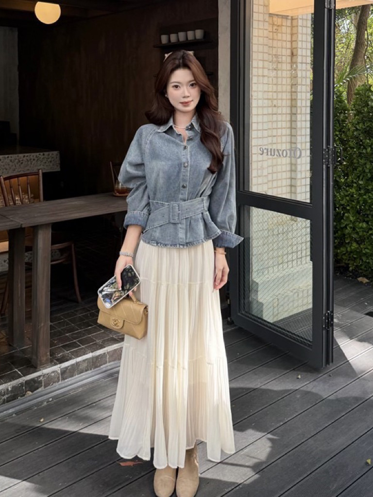 韩系气质浅蓝色牛仔衬衫女2026早春新款设计宽松显瘦腰带上衣套装