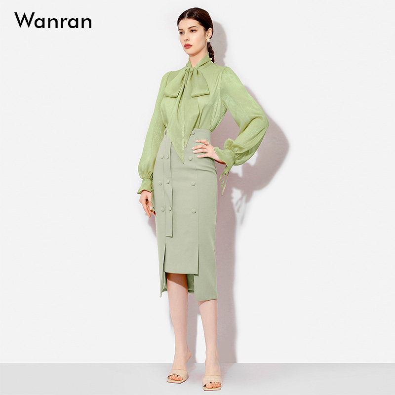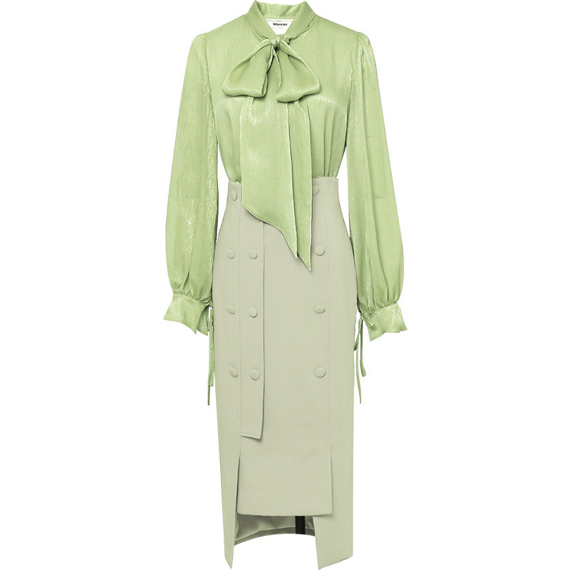 2026春装新款女装蝴蝶结灯笼袖衬衣不规则直筒半裙绿色早春套装