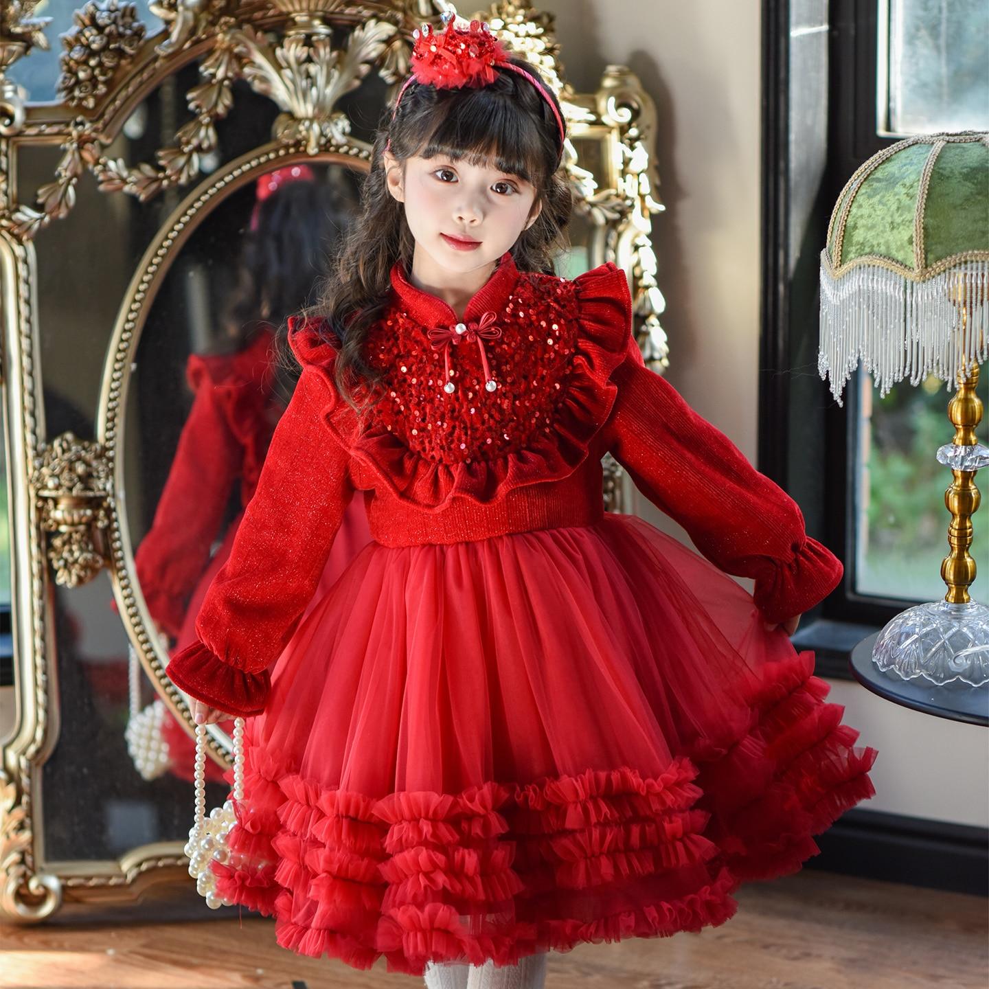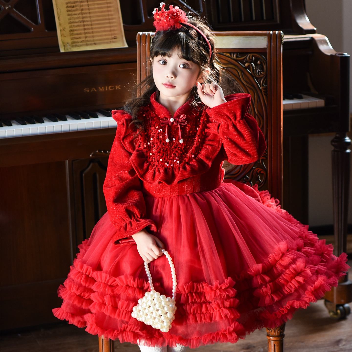女童连衣裙加绒裙子2026新款儿童女孩冬季红色洋气蓬蓬公主裙冬装