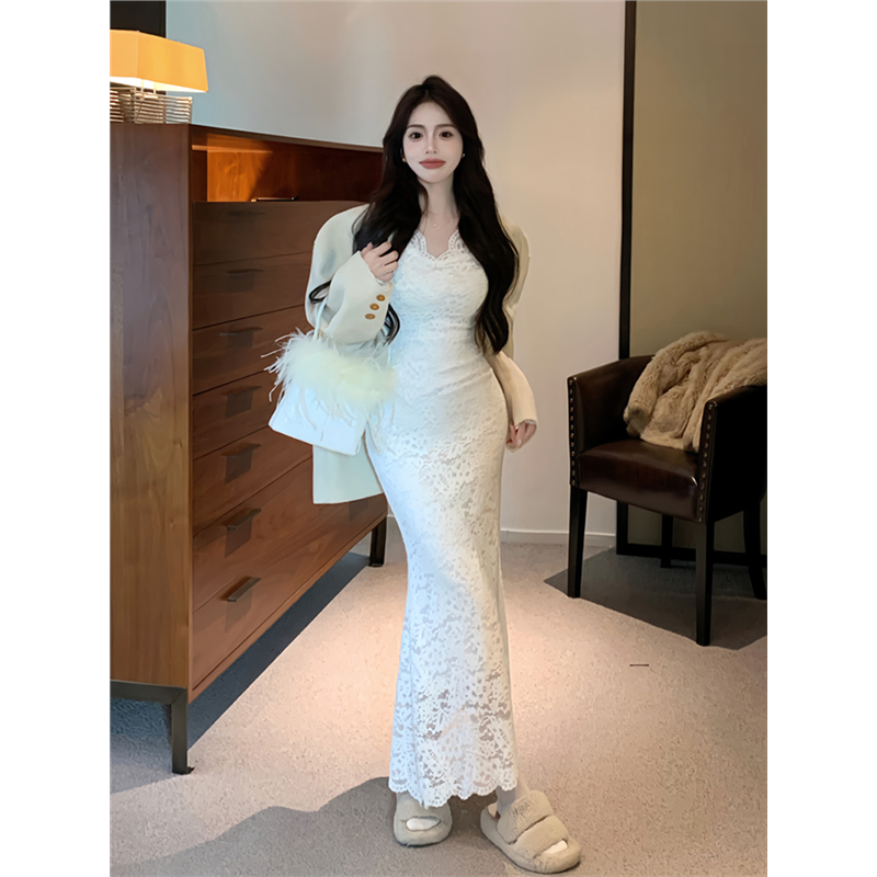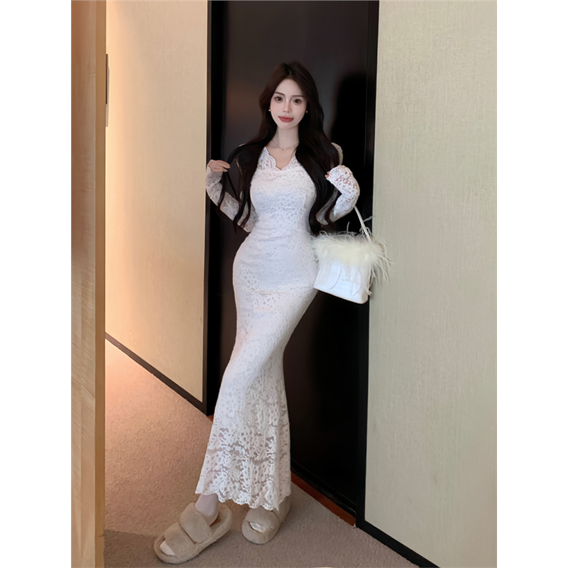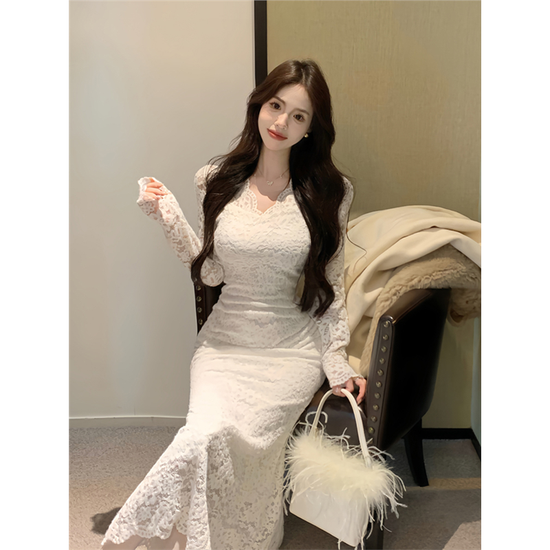 法式高级性感白色蕾丝连衣裙女春秋冬打底内搭气质包臀鱼尾长裙子