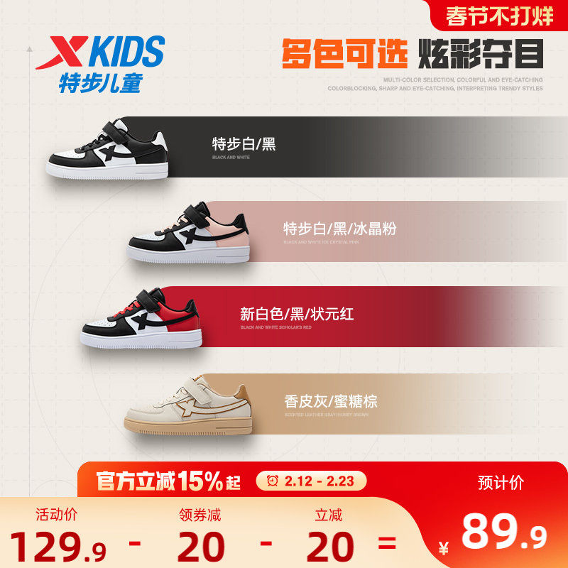 特步童鞋秋冬款儿童男童板鞋革面运动鞋黑白鞋子女童休闲鞋小白鞋