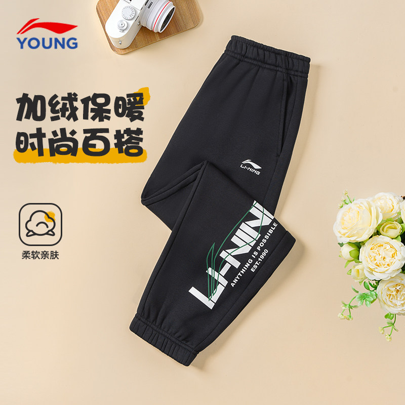 李宁男童加绒裤子2025冬季新款男女中大童棉质一体绒加厚保暖卫裤