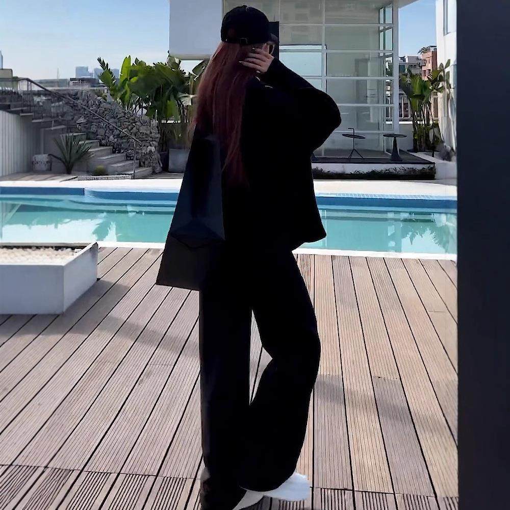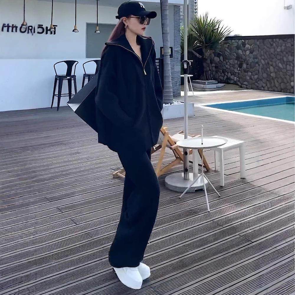 运动套装新款女装高级宽松上衣冬季两件套感加厚休闲黑色拉链时尚