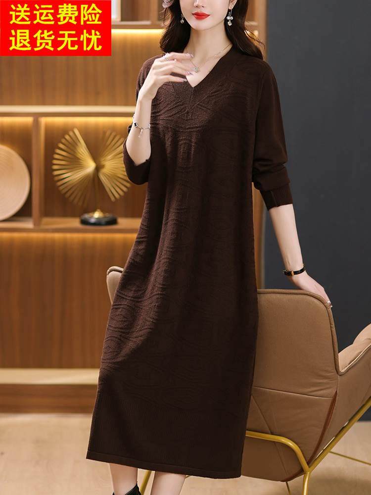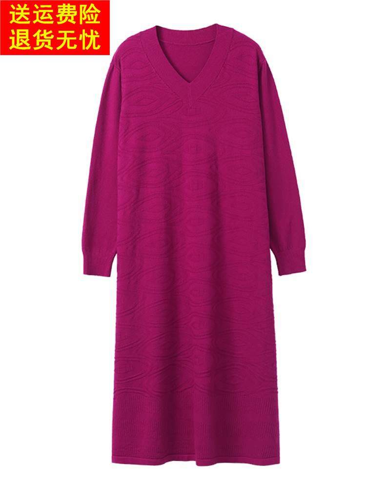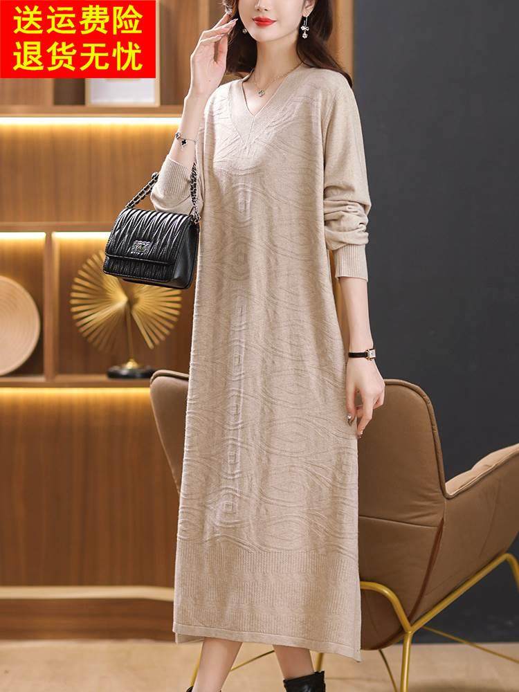 秋冬过膝长款连衣裙女大码宽松v领针织裙胖mm200斤宽松打底毛衣裙