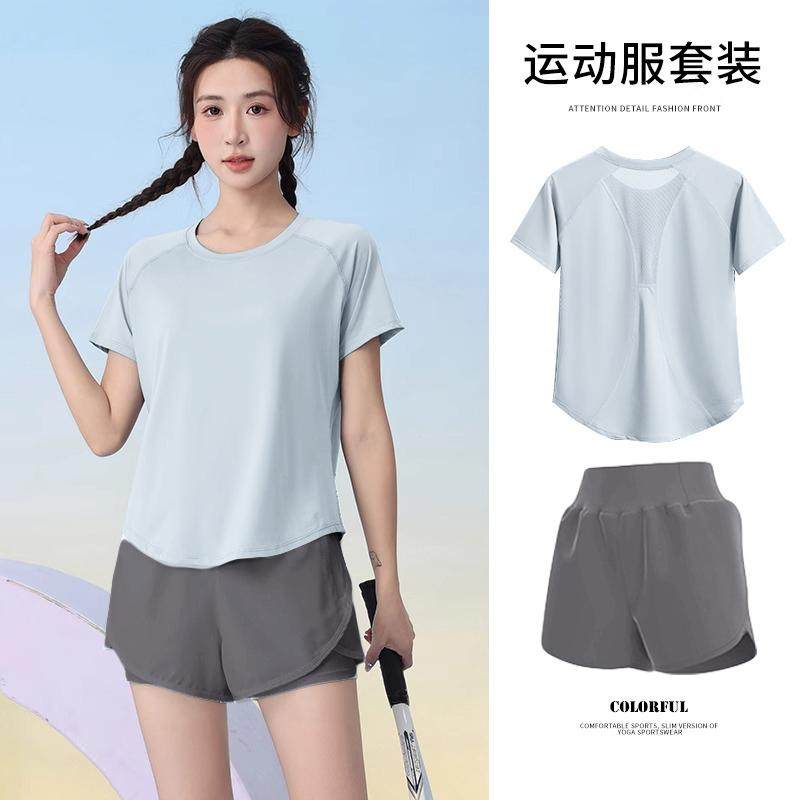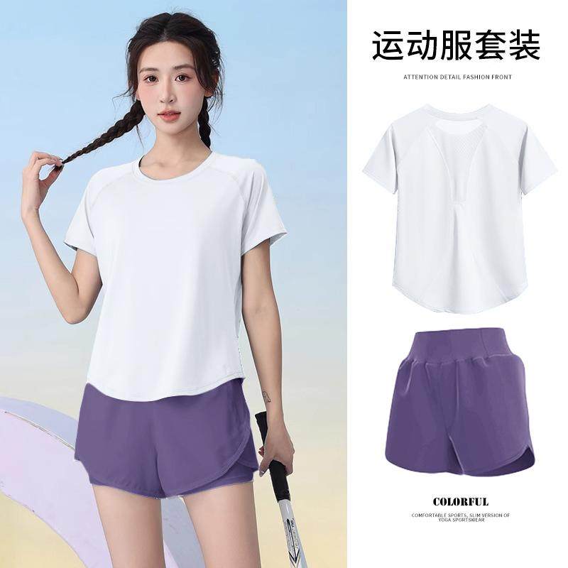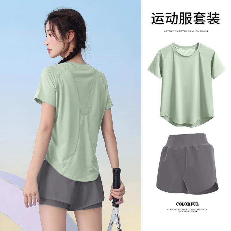夏季多巴胺穿搭轻薄透气羽毛球服女短袖健身宽松户外显瘦运动套装