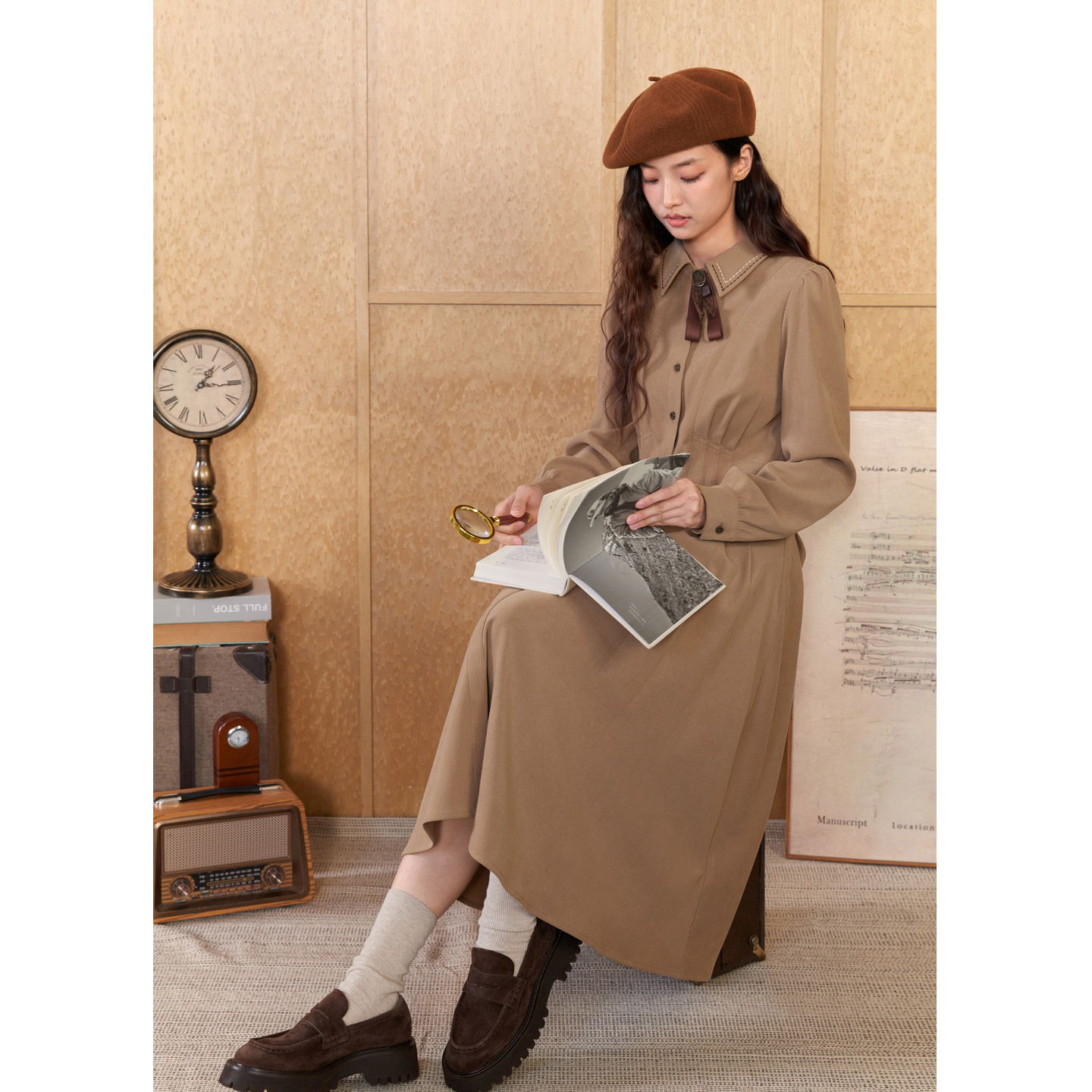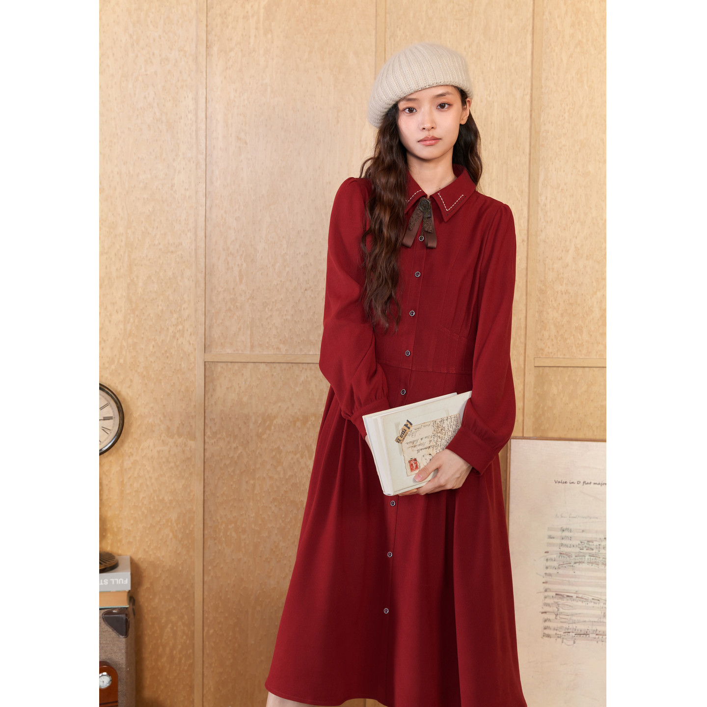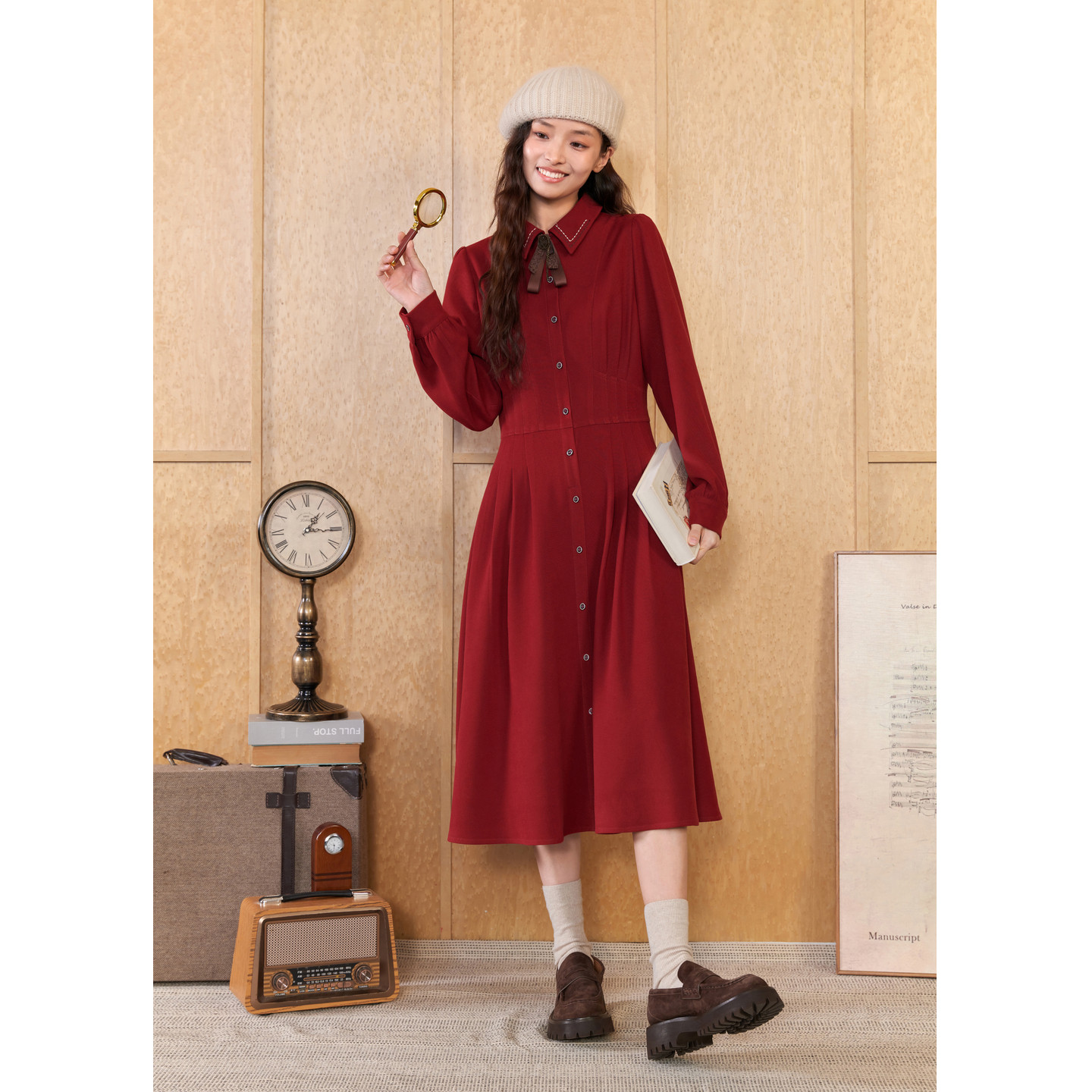 紫涵领结长袖衬衫连衣裙女冬季新款红色收腰显瘦中长款a字裙子