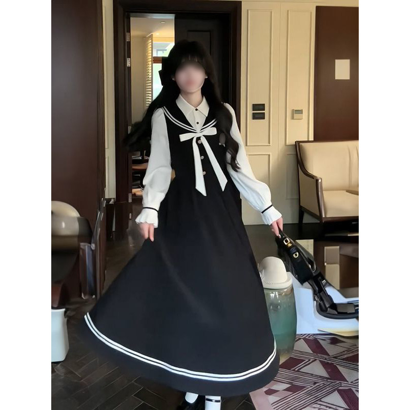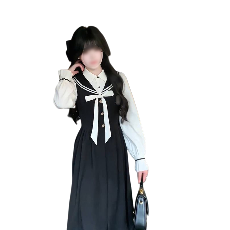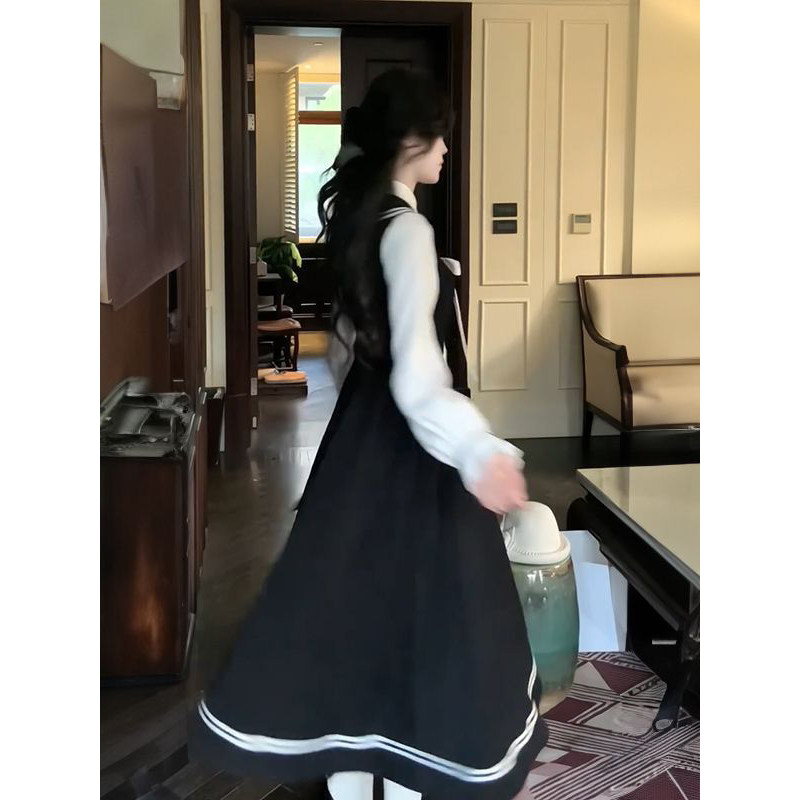高级感甜美时尚收腰显瘦假两件连衣裙女秋冬蝴蝶结中长款A字长裙