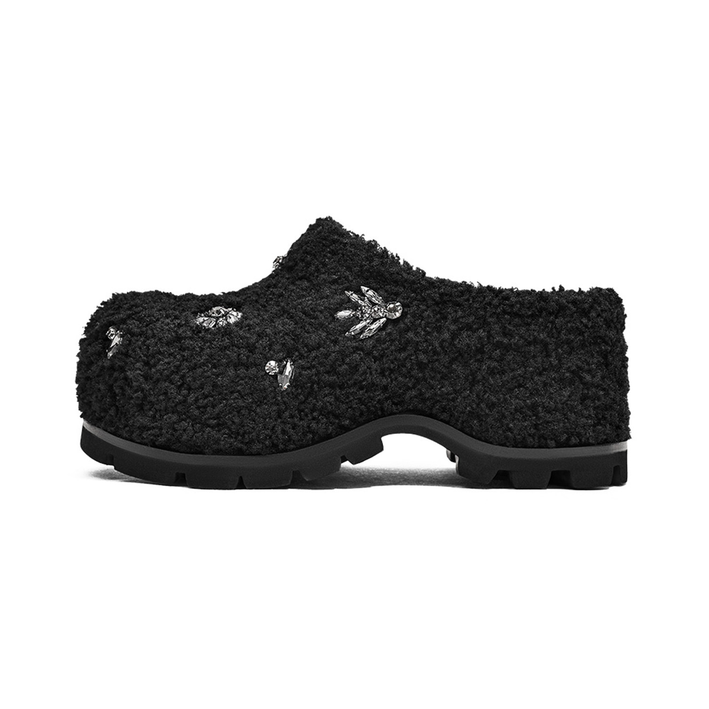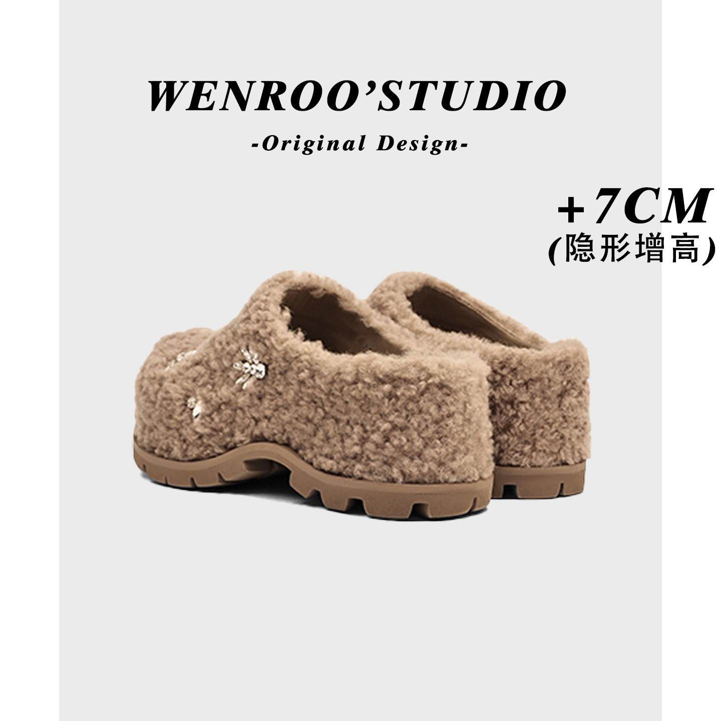 暖星絮语~黑色水钻羊羔绒增高7CM厚底勃肯鞋女秋冬外穿包头半拖鞋