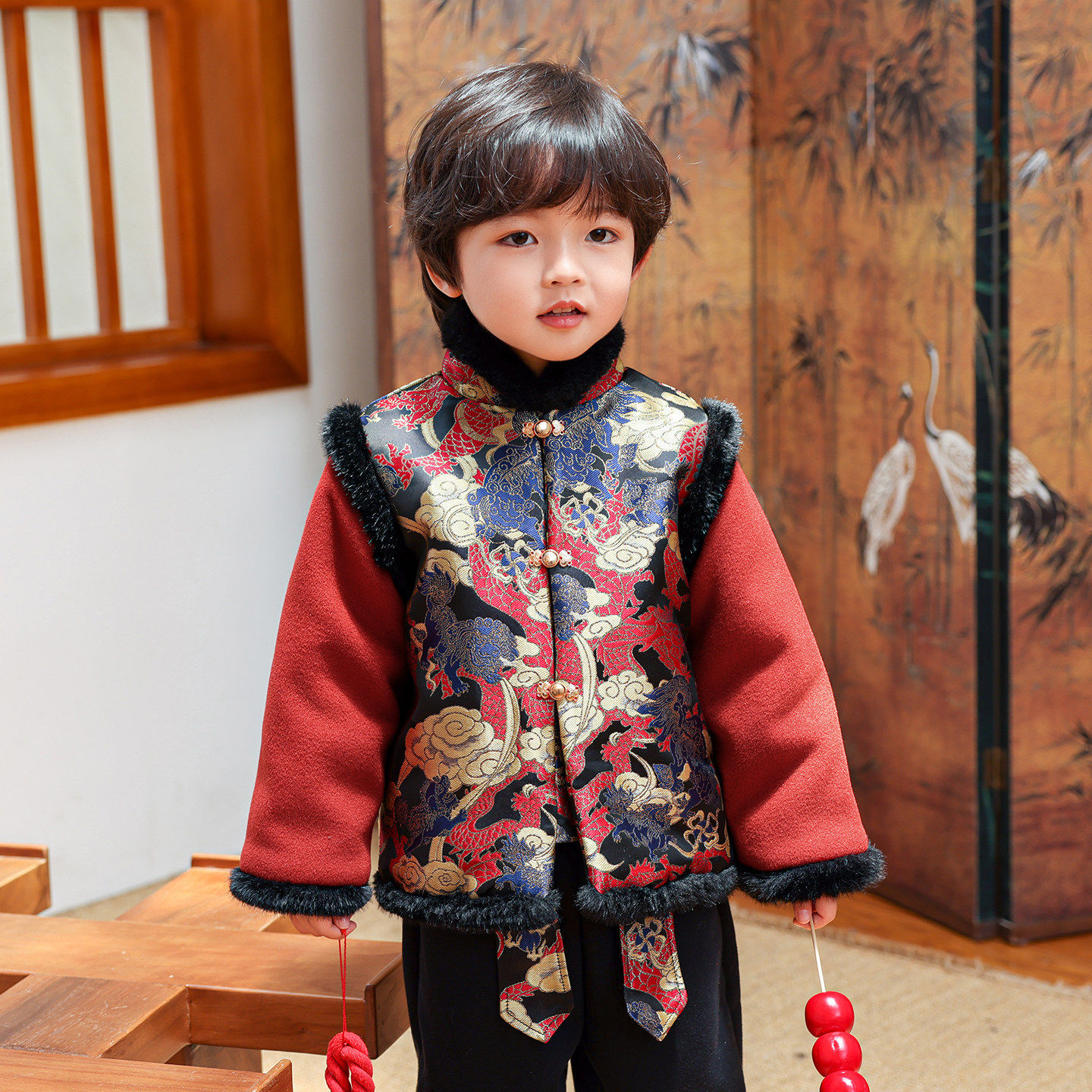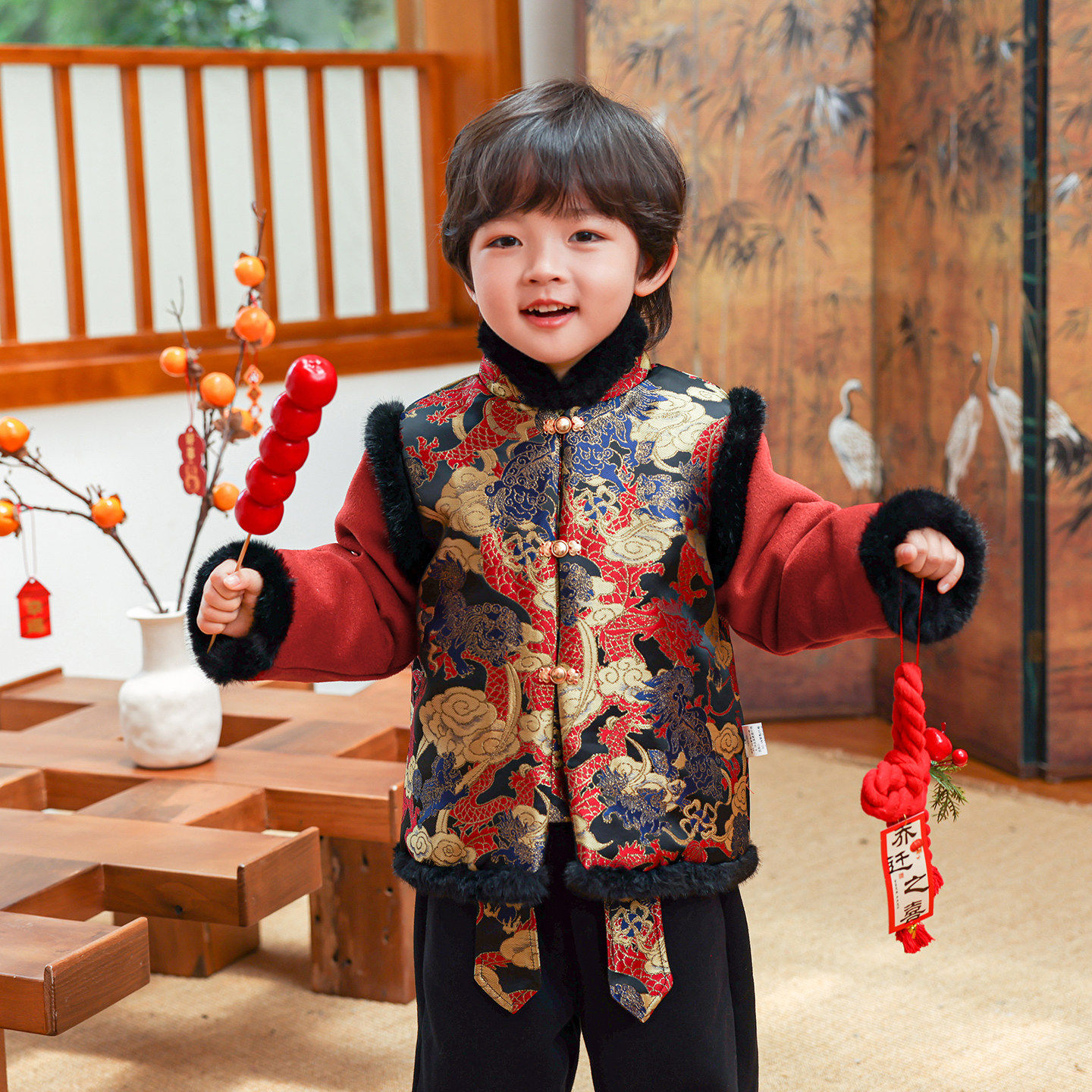 拜冬年服男童儿童过年喜庆衣服冬装新年红色新中式国风外套高级感