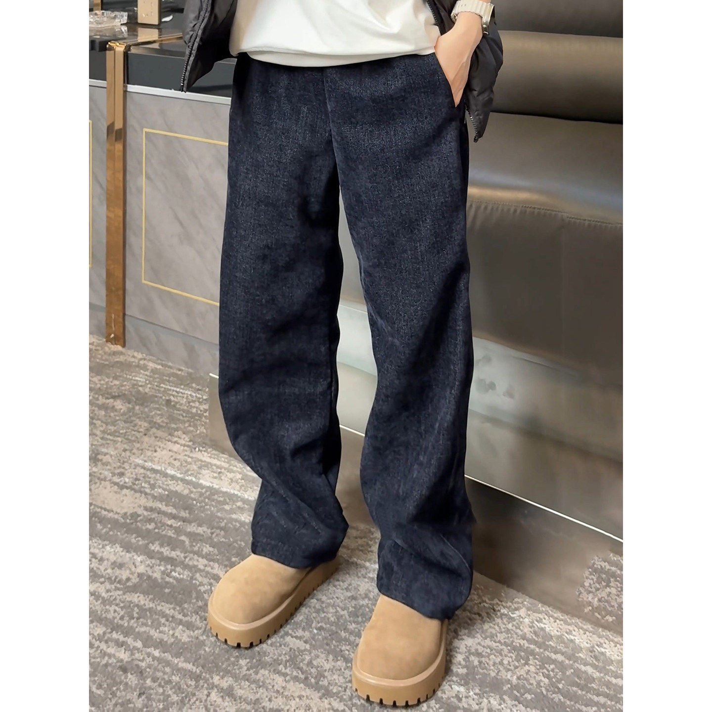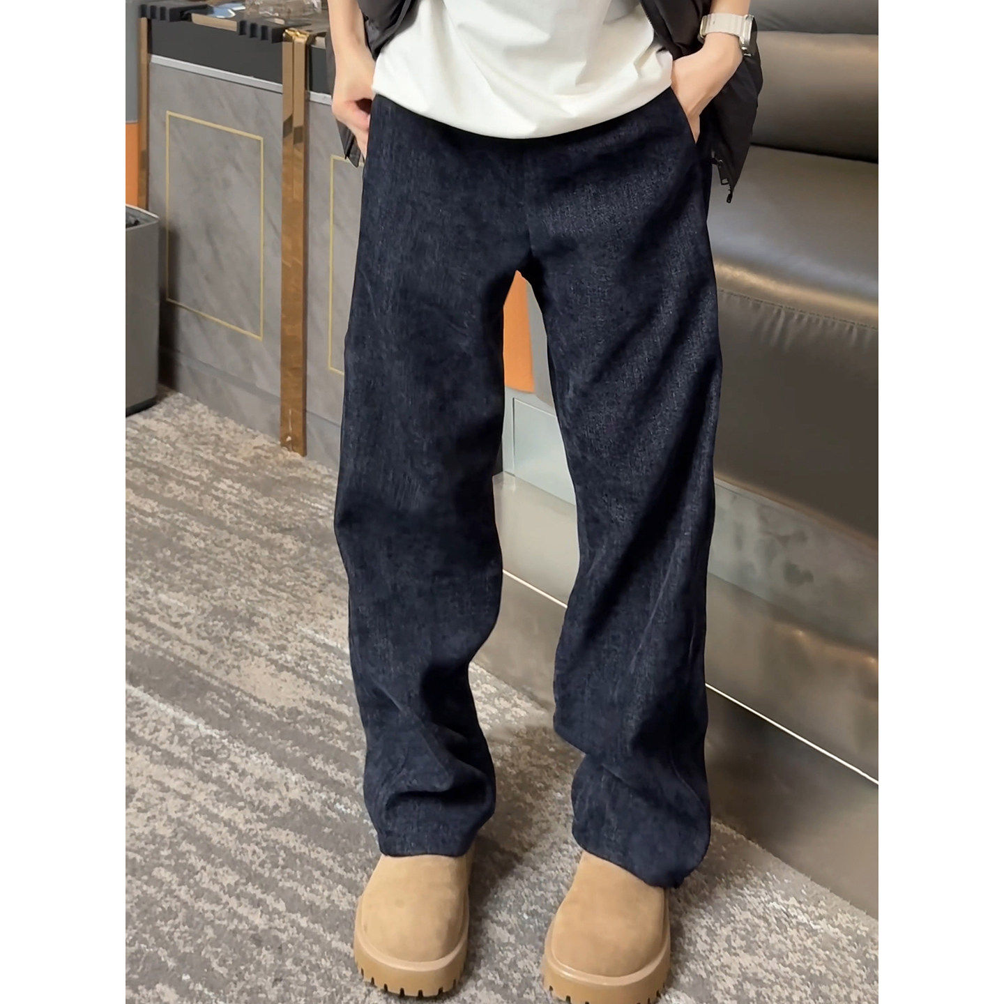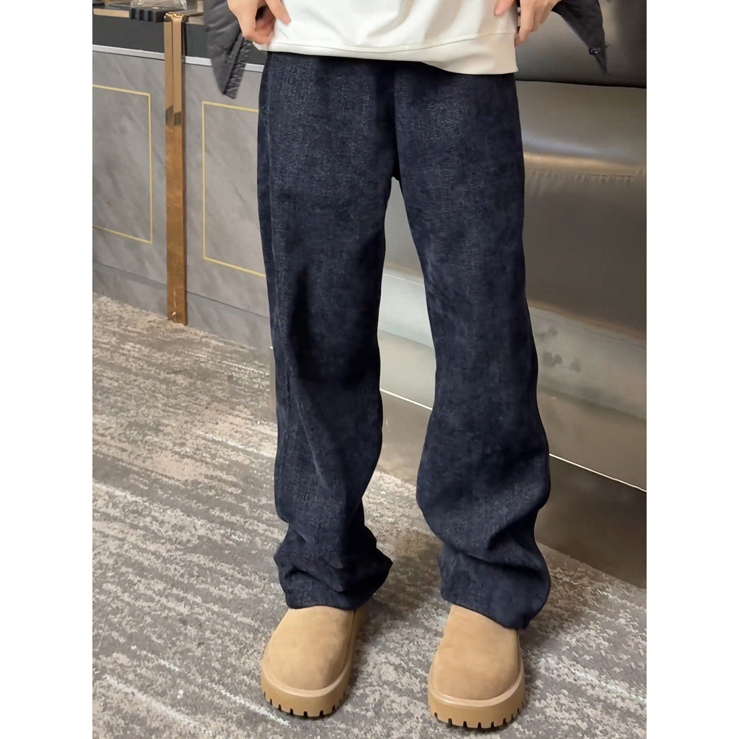 深蓝色美式加绒裤子男款秋冬重磅水洗牛仔休闲裤垂感宽松直筒卫裤