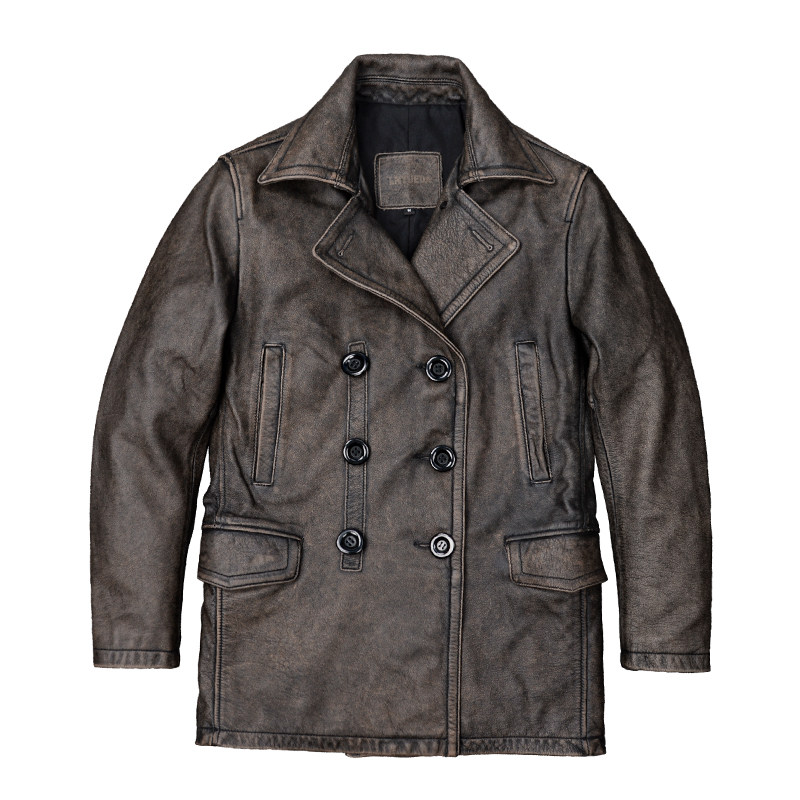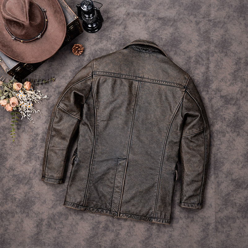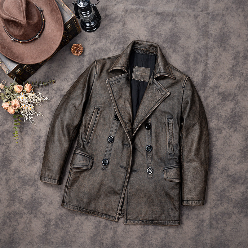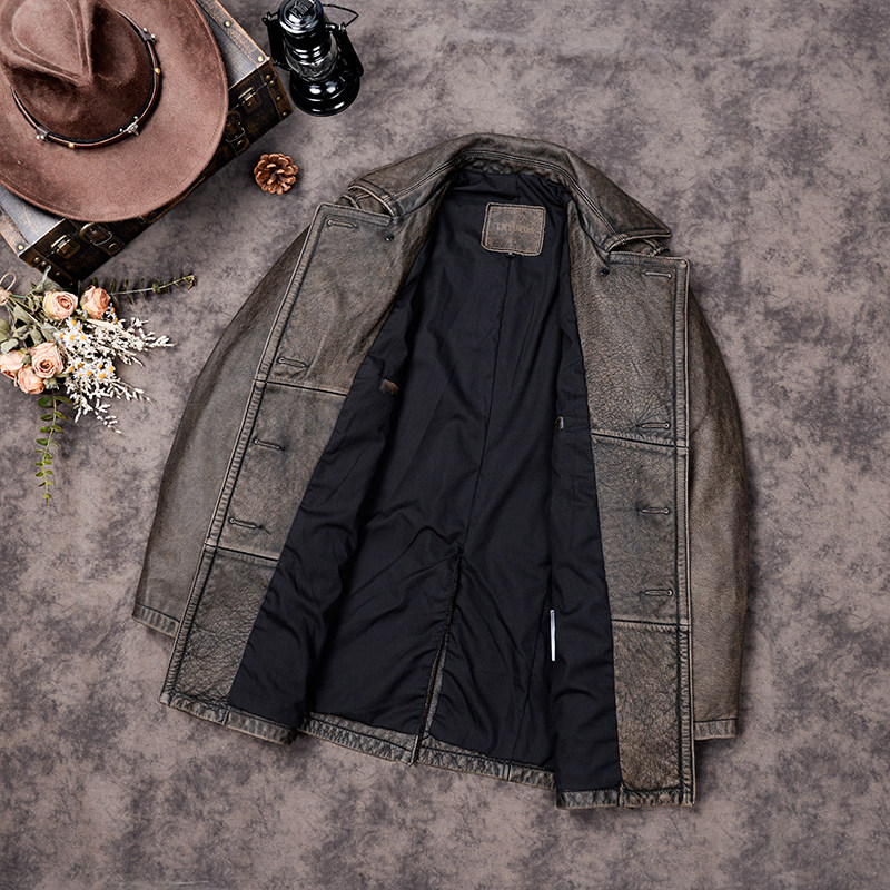 中长款真皮皮衣男士双排扣风衣做旧头层牛皮夹克740大码商务外套