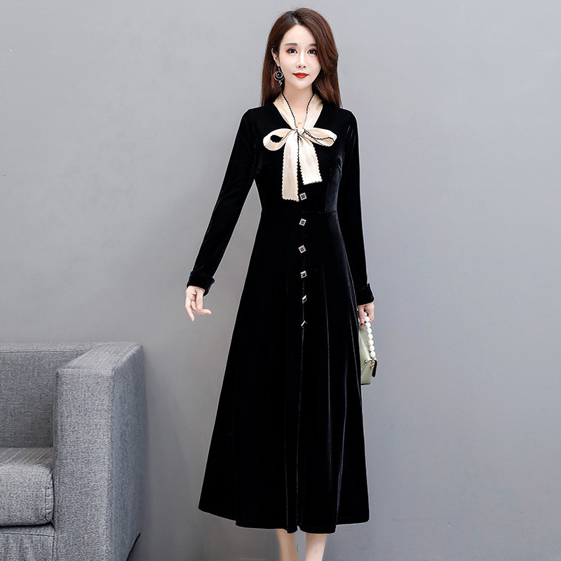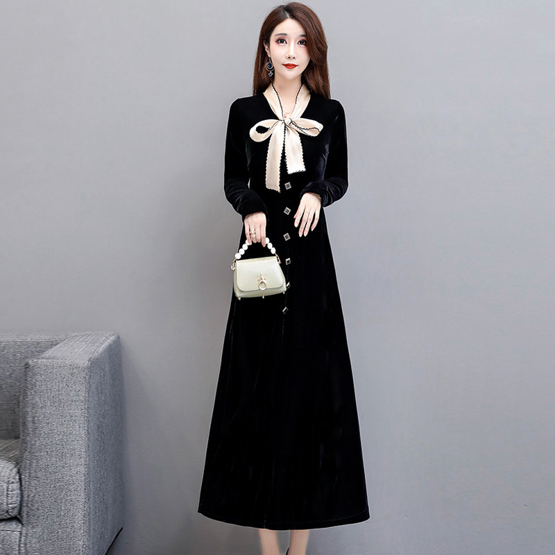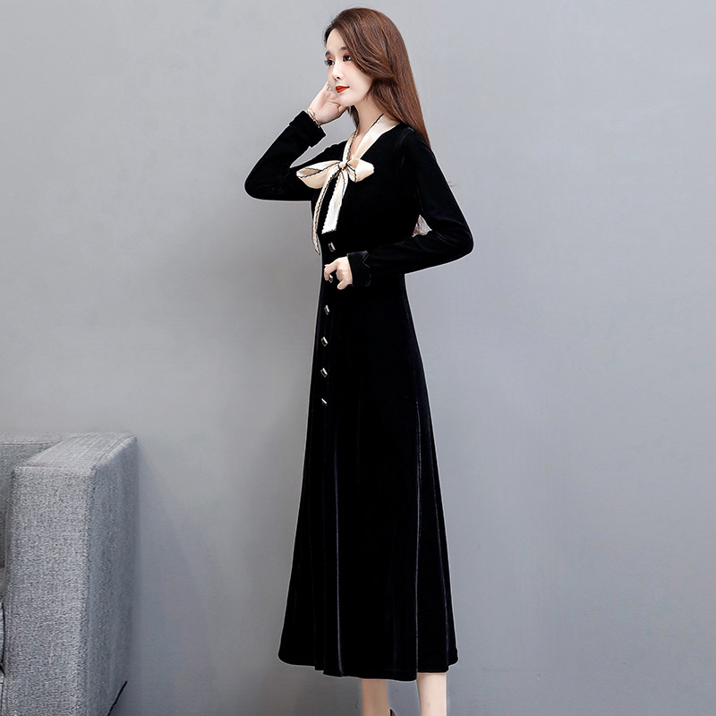 v领金丝绒连衣裙长袖女秋冬法式复古打底裙内搭黑色丝绒长裙女冬