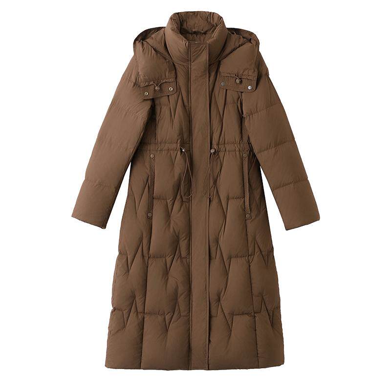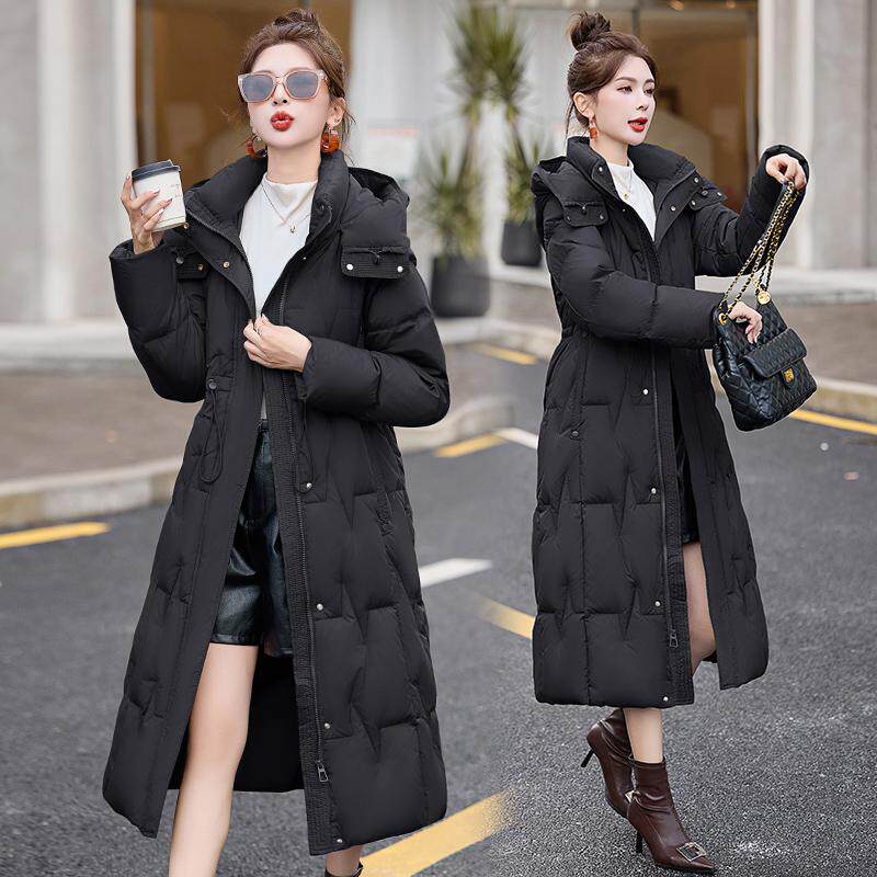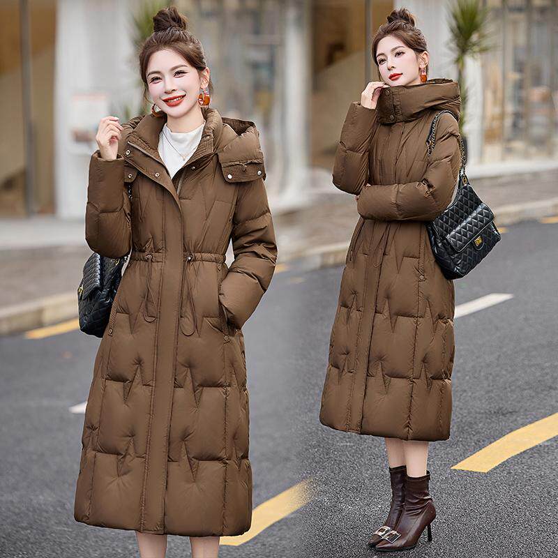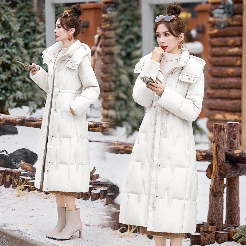 2025新款时尚羽绒服女冬束腰修身长款过膝加厚保暖连帽白鸭绒外套