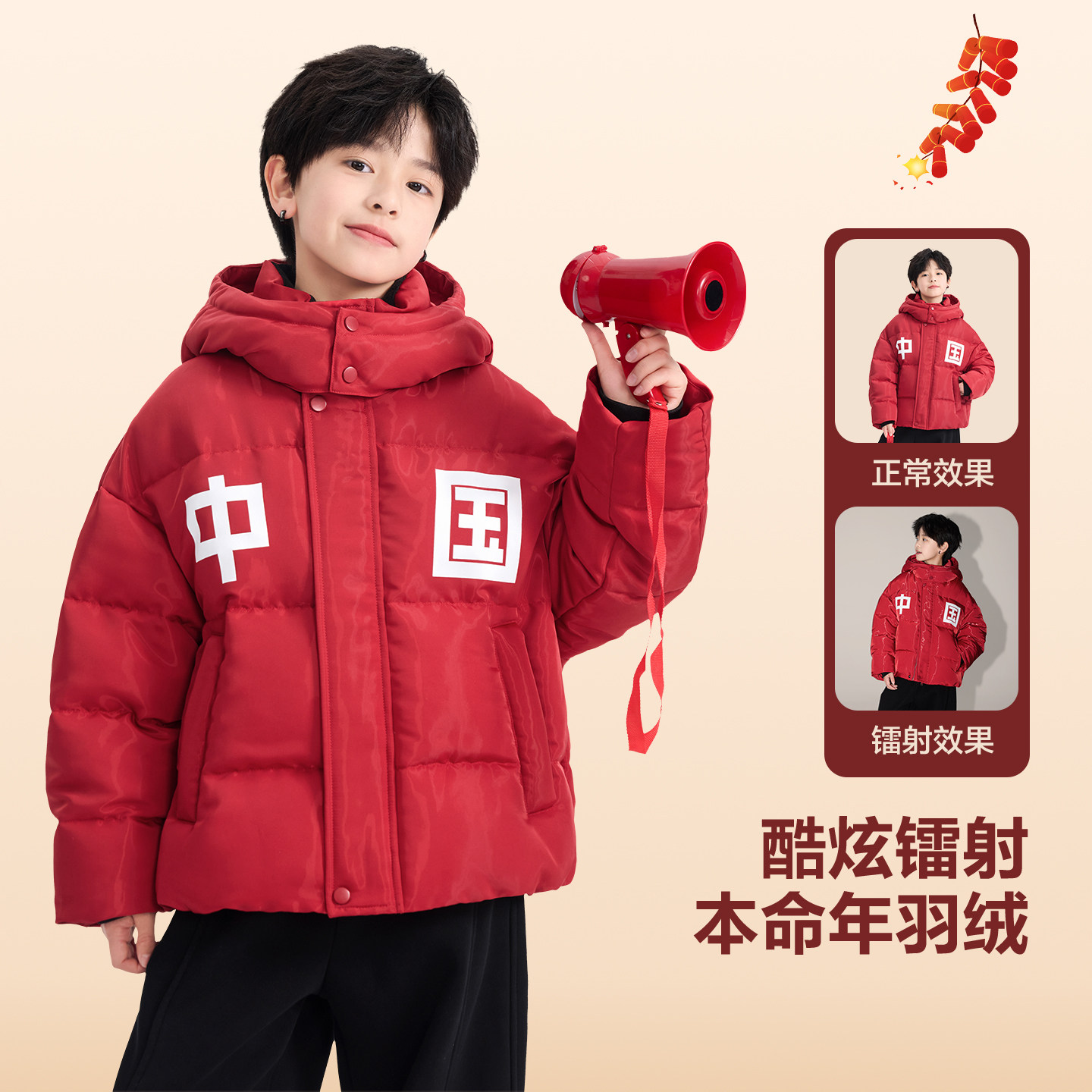 男童冬季红色镭射镜面反光羽绒服2026新款青少年儿童防寒新年外套