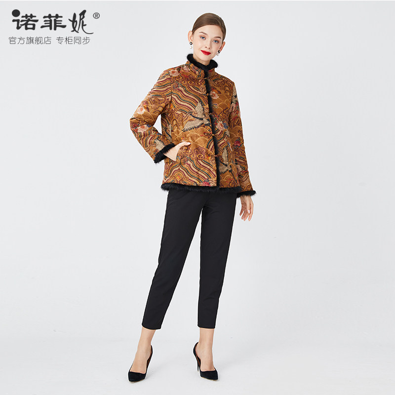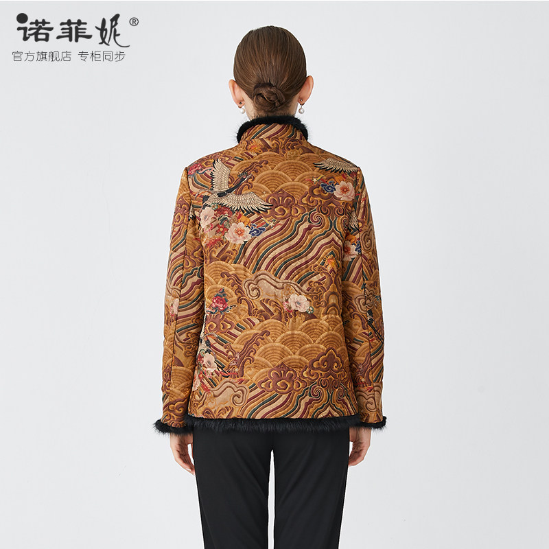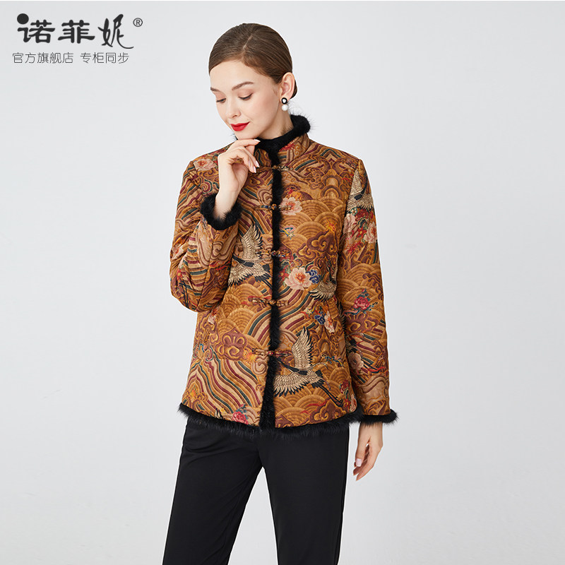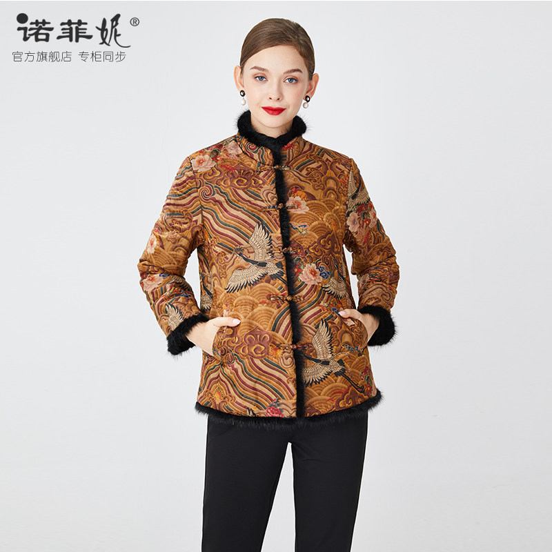 中老年品牌女装冬装新款国风真丝莨绸香云纱保暖棉衣水貂毛领棉服