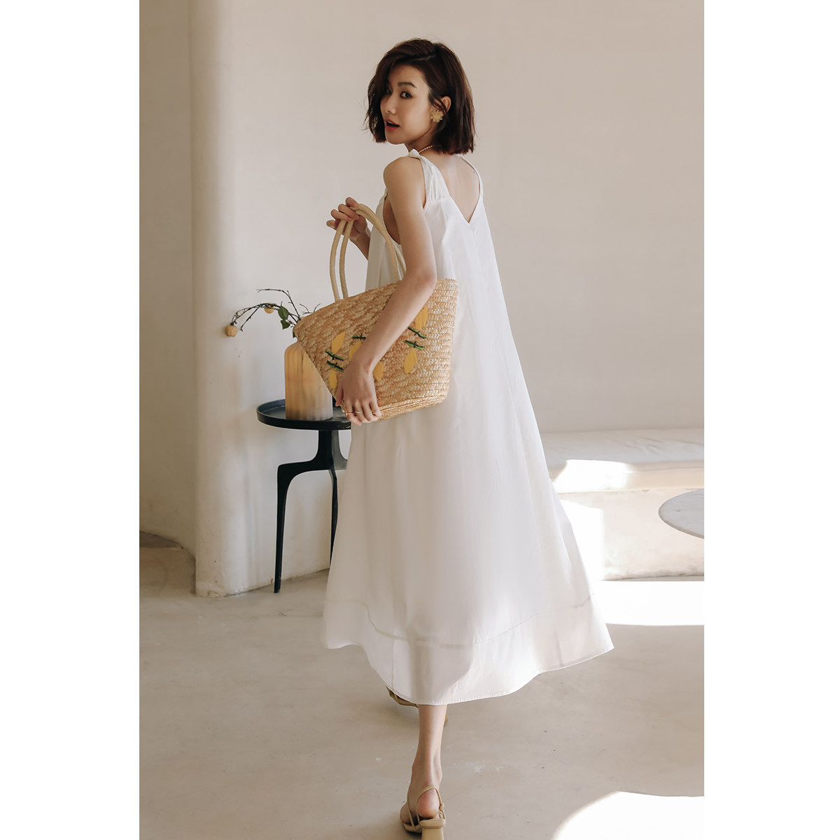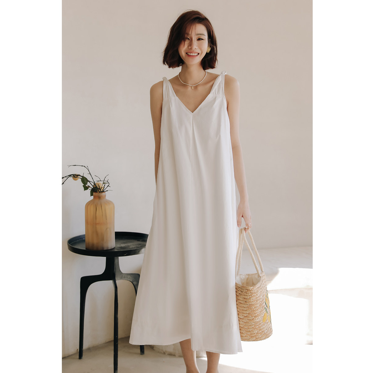 弥古v领法式背心裙高级感白色吊带连衣裙女夏宽松度假风仙女长裙
