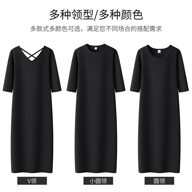黑色修身气质连衣裙女夏季中长款中袖休闲显瘦七分袖百搭打底长裙