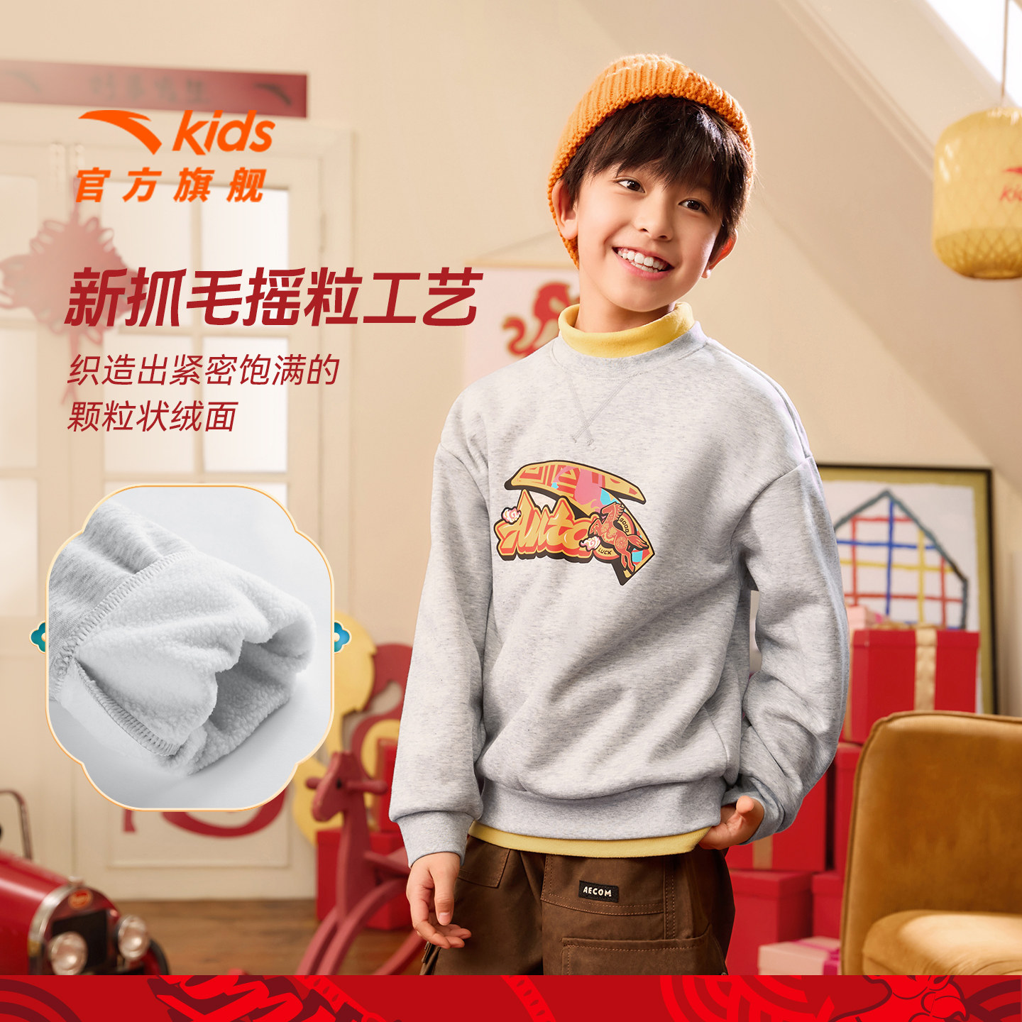 【新年马年】安踏儿童新年加绒卫衣男童红色亲肤套头衫A52618719