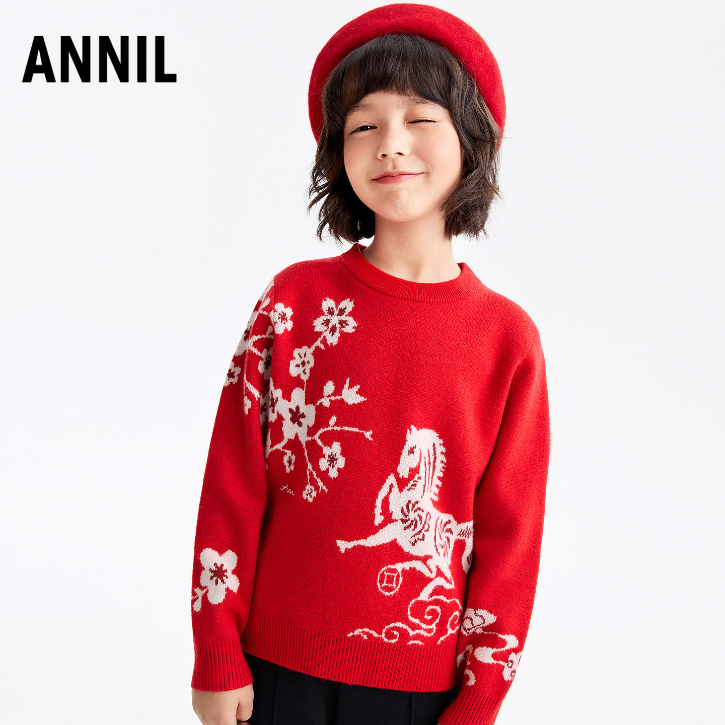 安奈儿童装女童马年生肖款圆领红色毛衣2026春新款新年喜庆针织衫