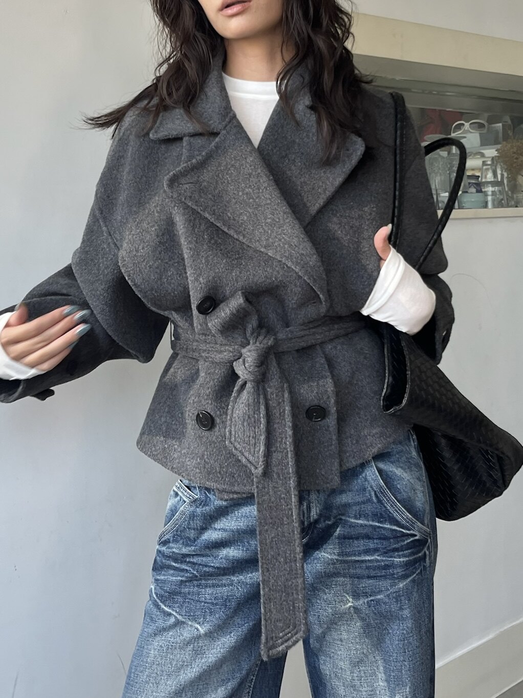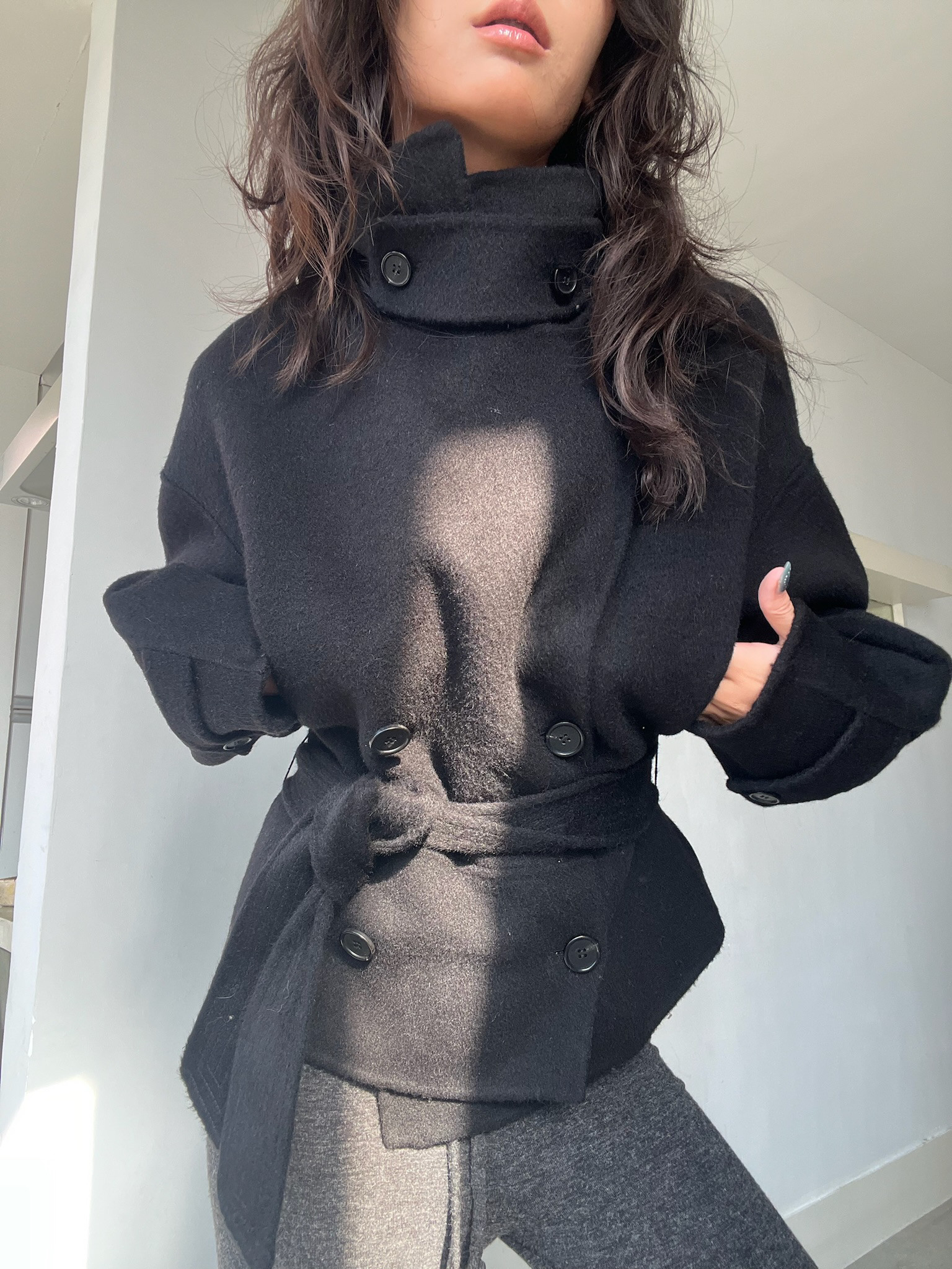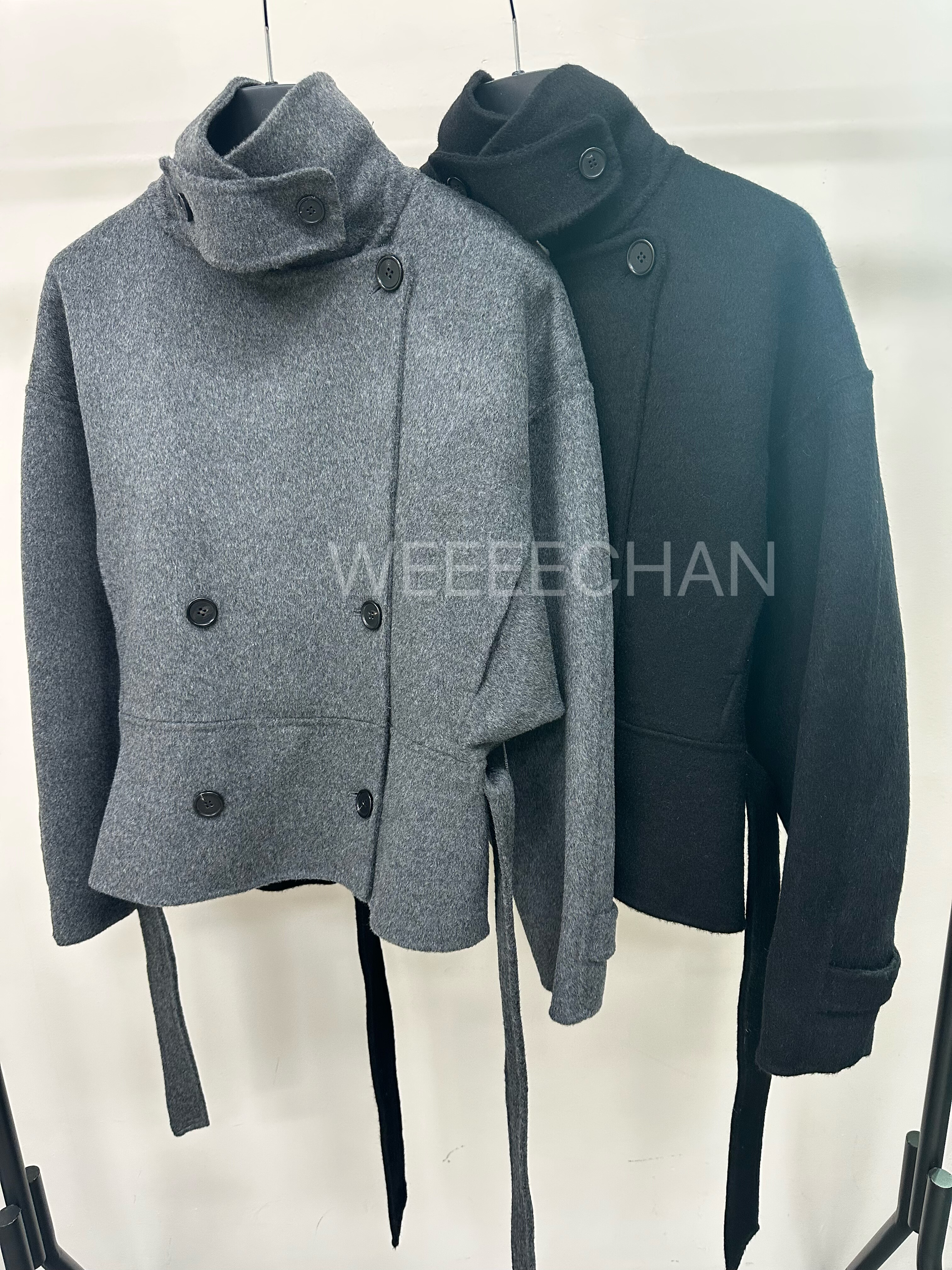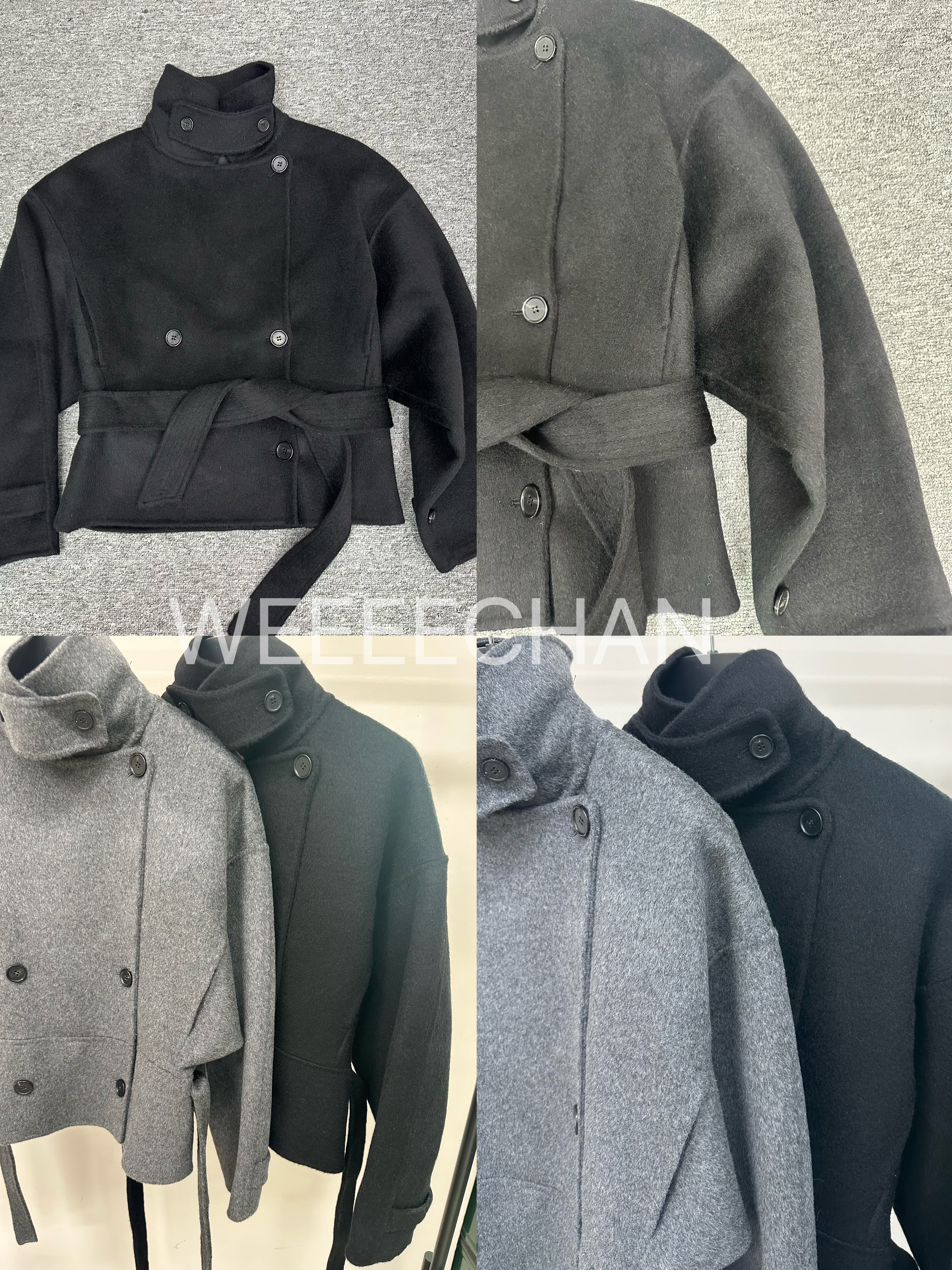 现货手工缝制 WEEEECHAN 双排扣系带短款羊毛双面呢大衣外套