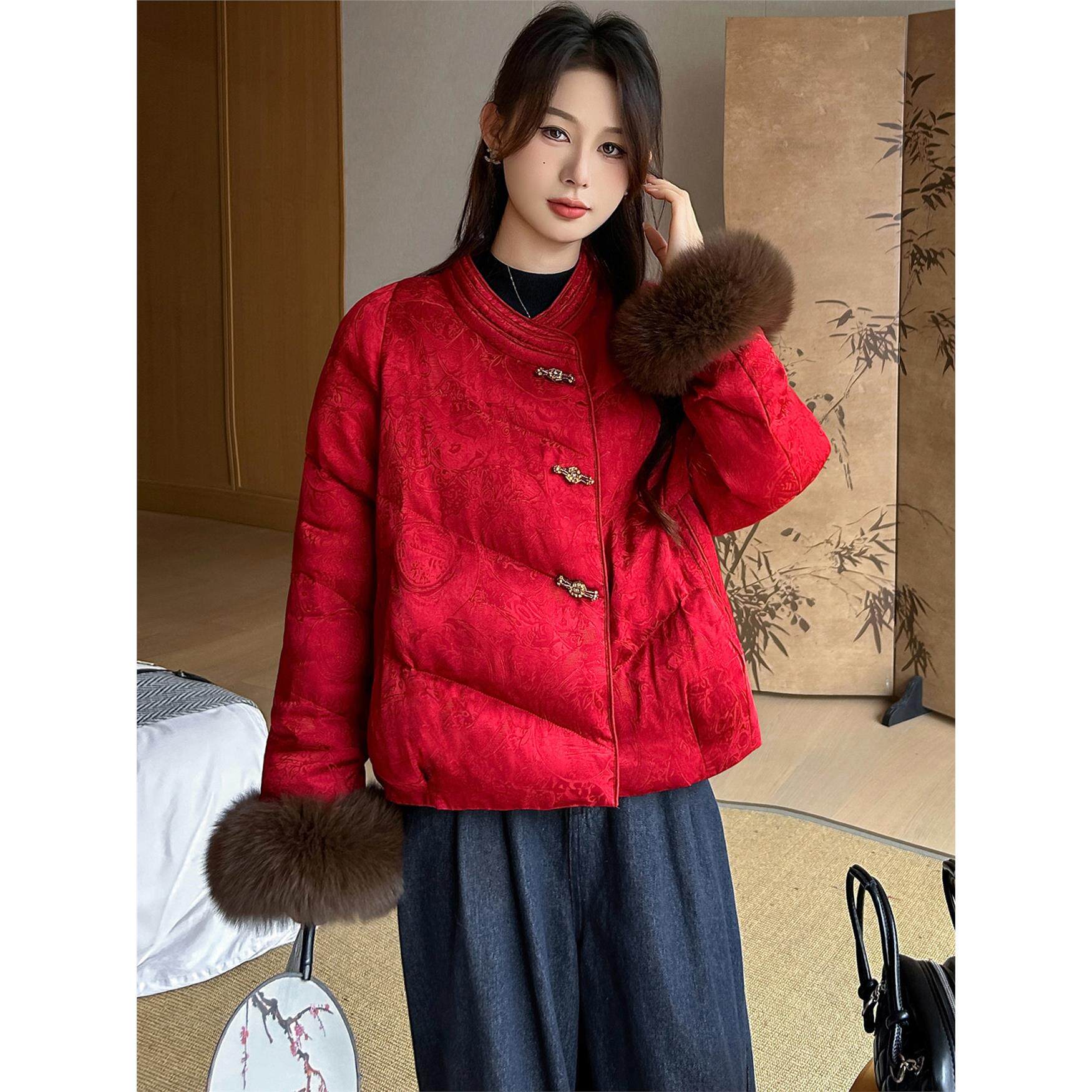 新中式红色国风短款立领羽绒服女款2026秋冬季白鸭绒保暖厚款外套