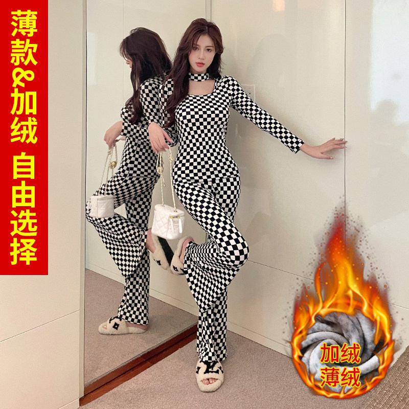 2025冬季新款圆领豹纹加绒薄绒长袖套装女时尚洋气大码长裤喇叭裤