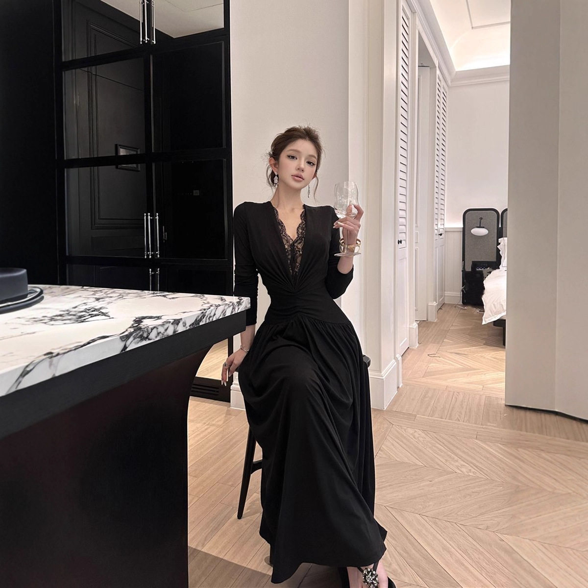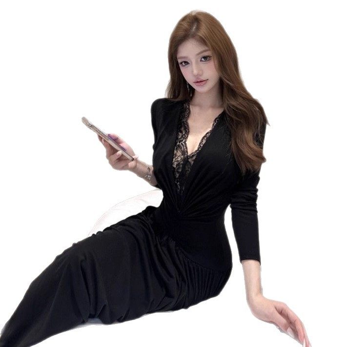 2025早秋新款法式复古蕾丝拼接V领白色长袖连衣裙女性感包臀裙子