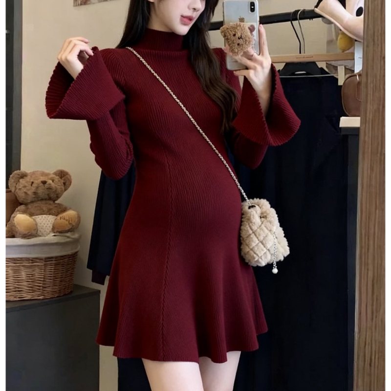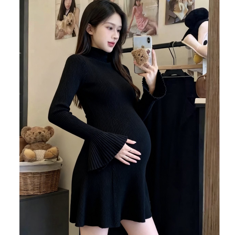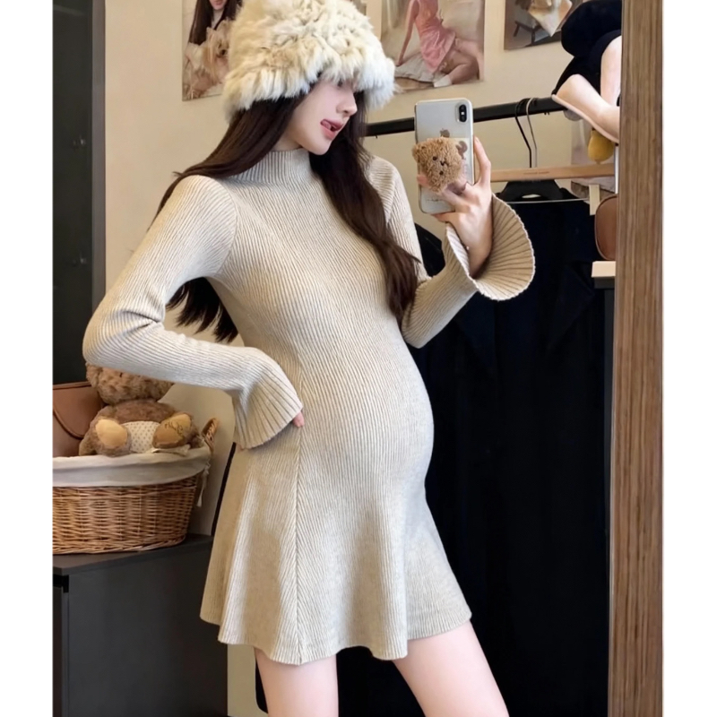 孕妇装秋冬新款加厚时尚半高领针织连衣裙女修身显瘦气质内搭短裙