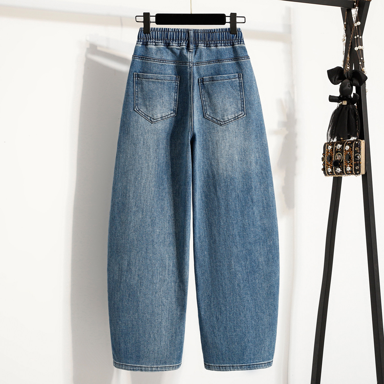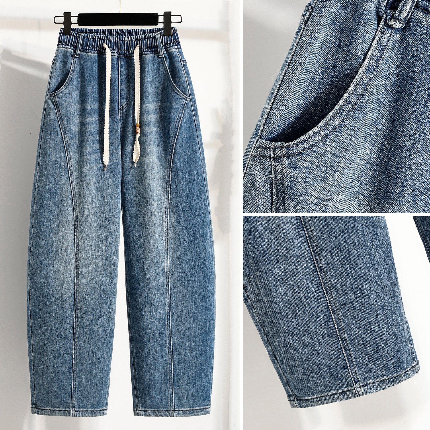 浅蓝色牛仔裤香蕉裤女2026早春新款大码胖mm梨形遮肉显瘦弯刀裤子