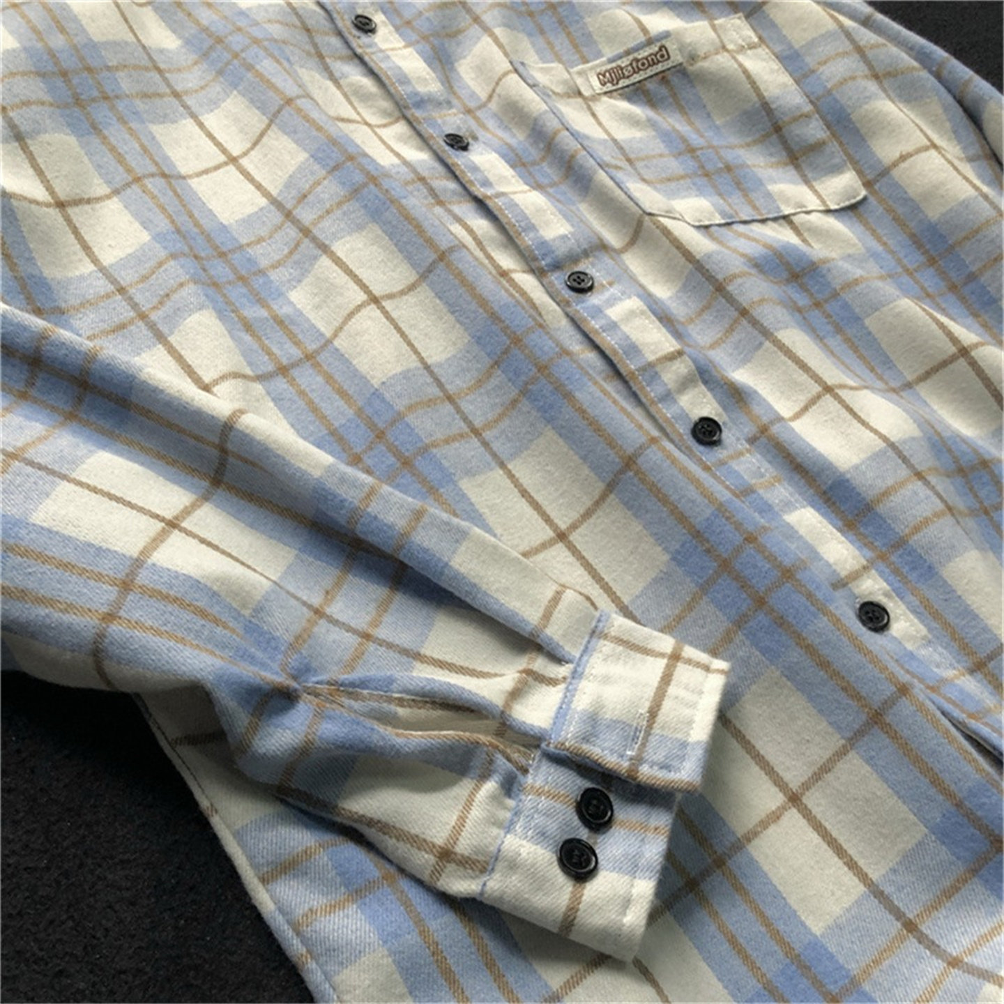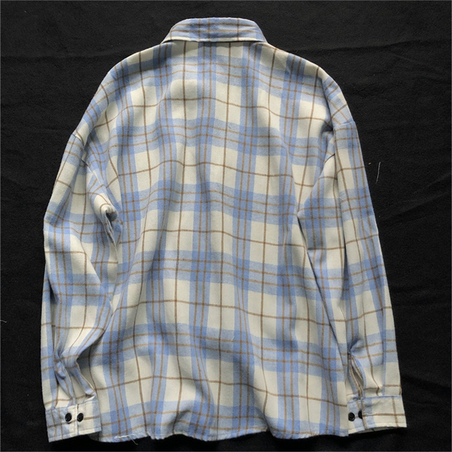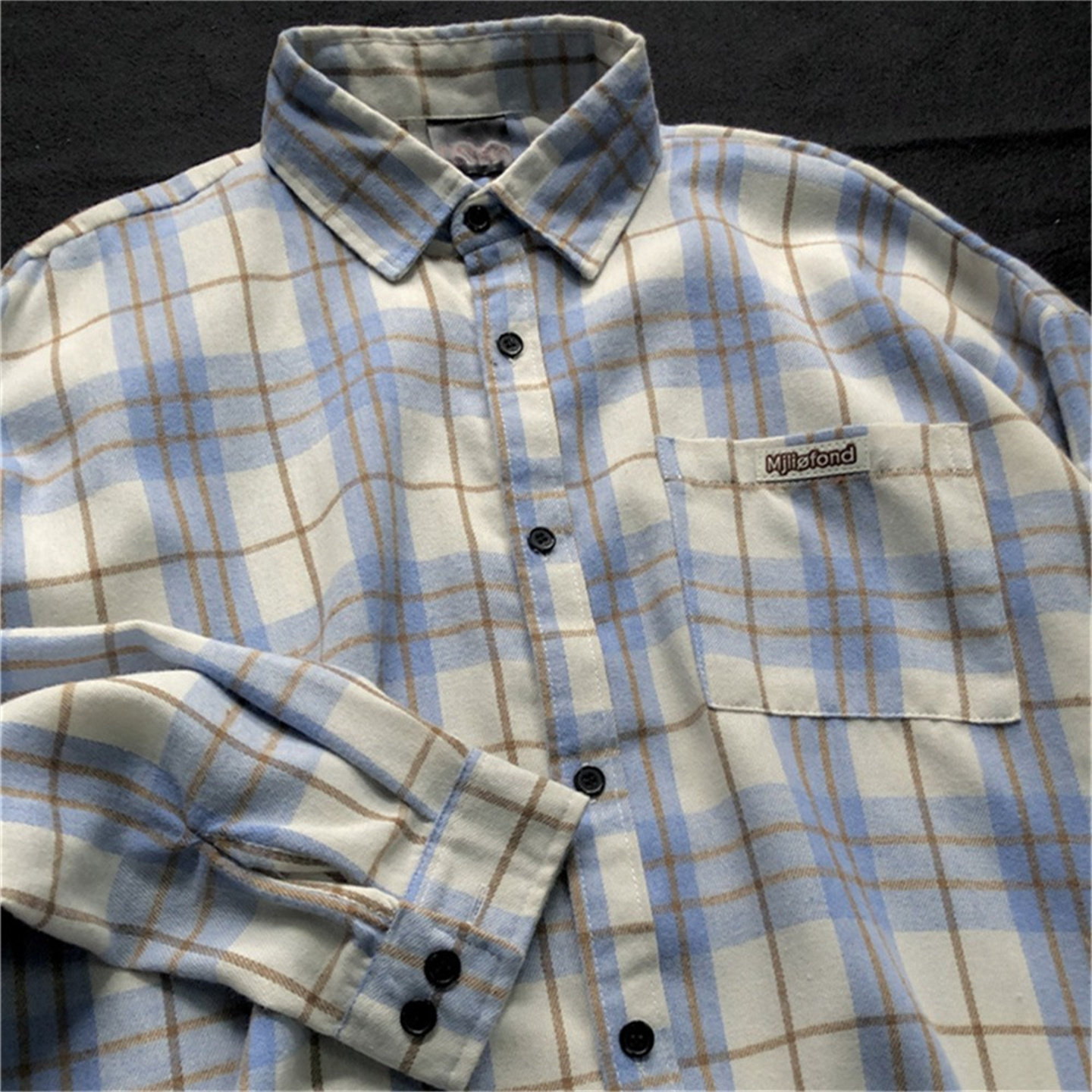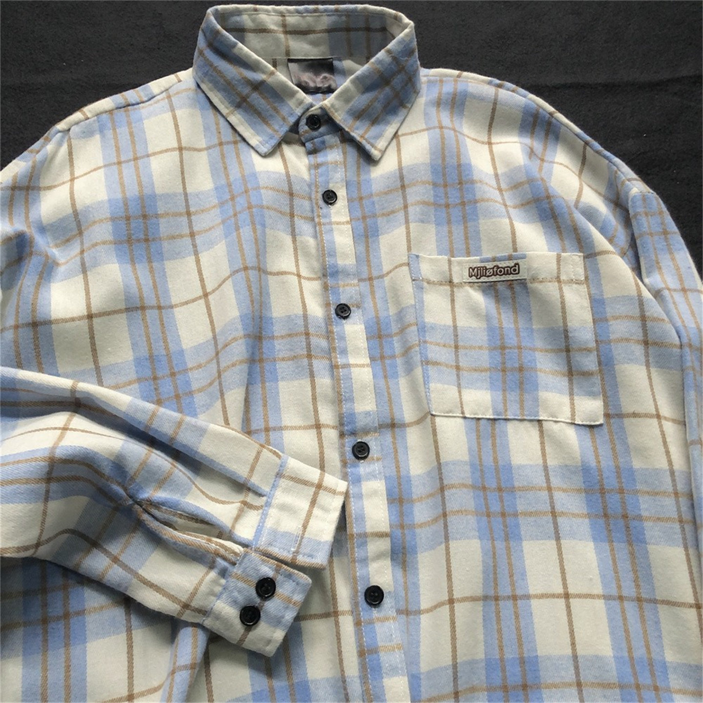 2026新款高级感痞帅风长袖衬衣男秋季浅蓝格子衬衫上衣女外套蓝色