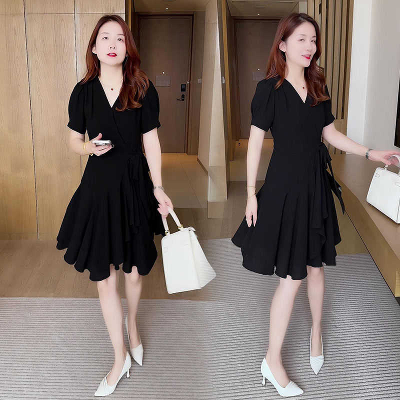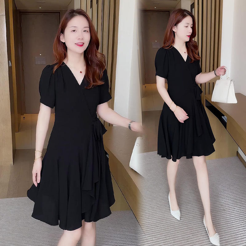 时尚气质V领连衣裙女夏季2025新款小个子中长款收腰显瘦纯色裙子